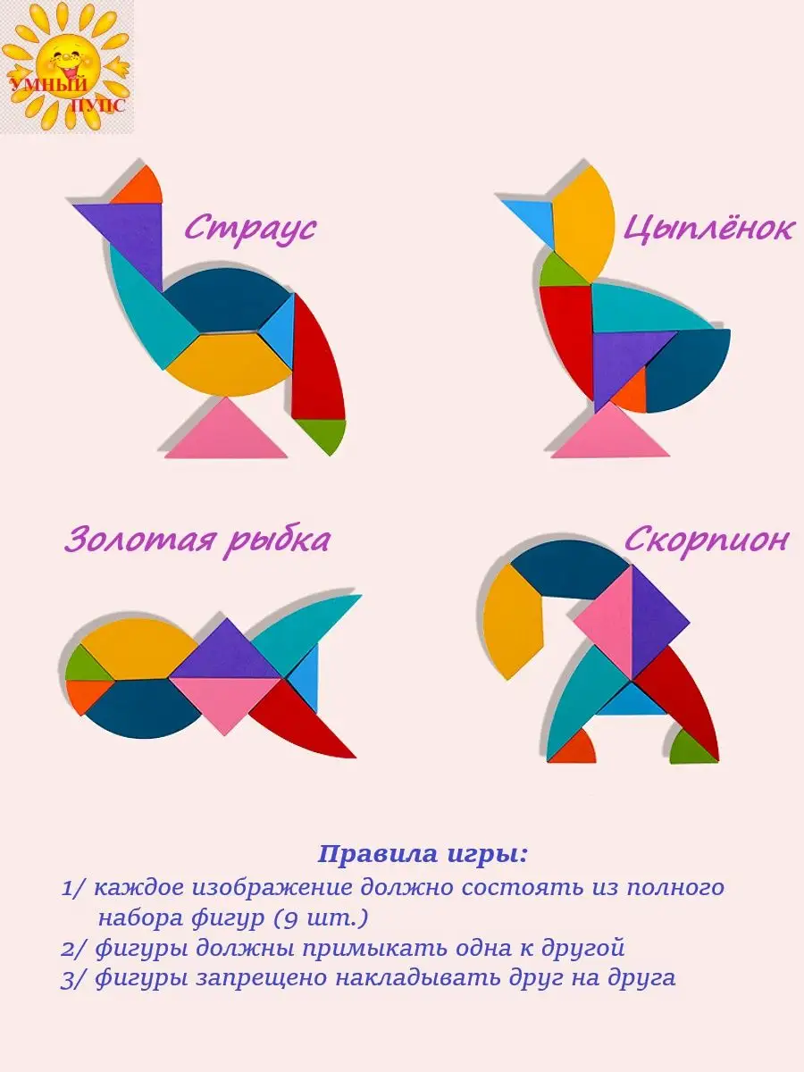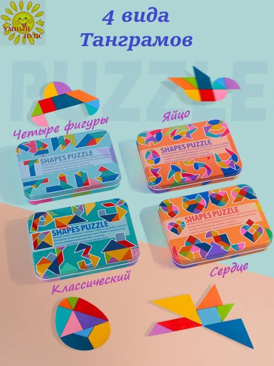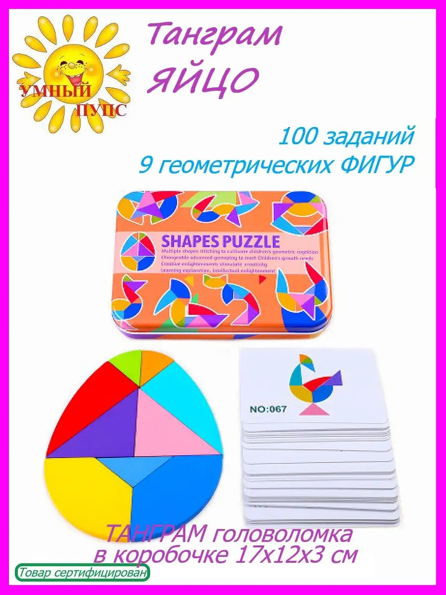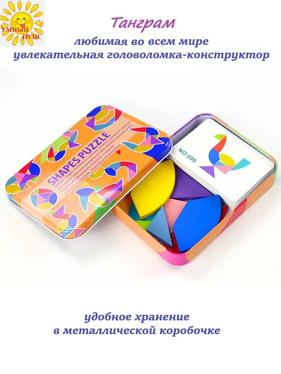 Танграм деревянный головоломка с карточками в коробочке