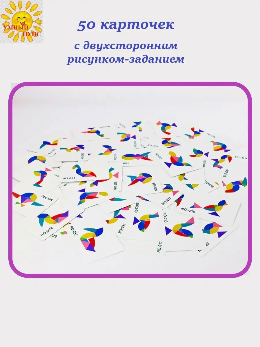 Комплектация 50-60 двухсторонних карточек с заданиями 100-120 размер 10х7 см; металлическая коробочка для хранения 17х12х3 см; танграм деревянный с геометрическими фигурами