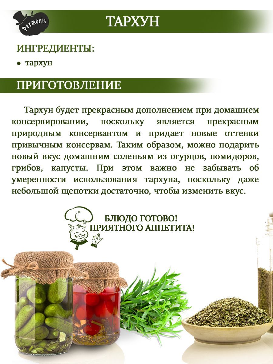 Описание: Тархун будет прекрасным дополнением при домашнем консервировании, поскольку является прекрасным природным консервантом и придает новые оттенки привычным консервам.
