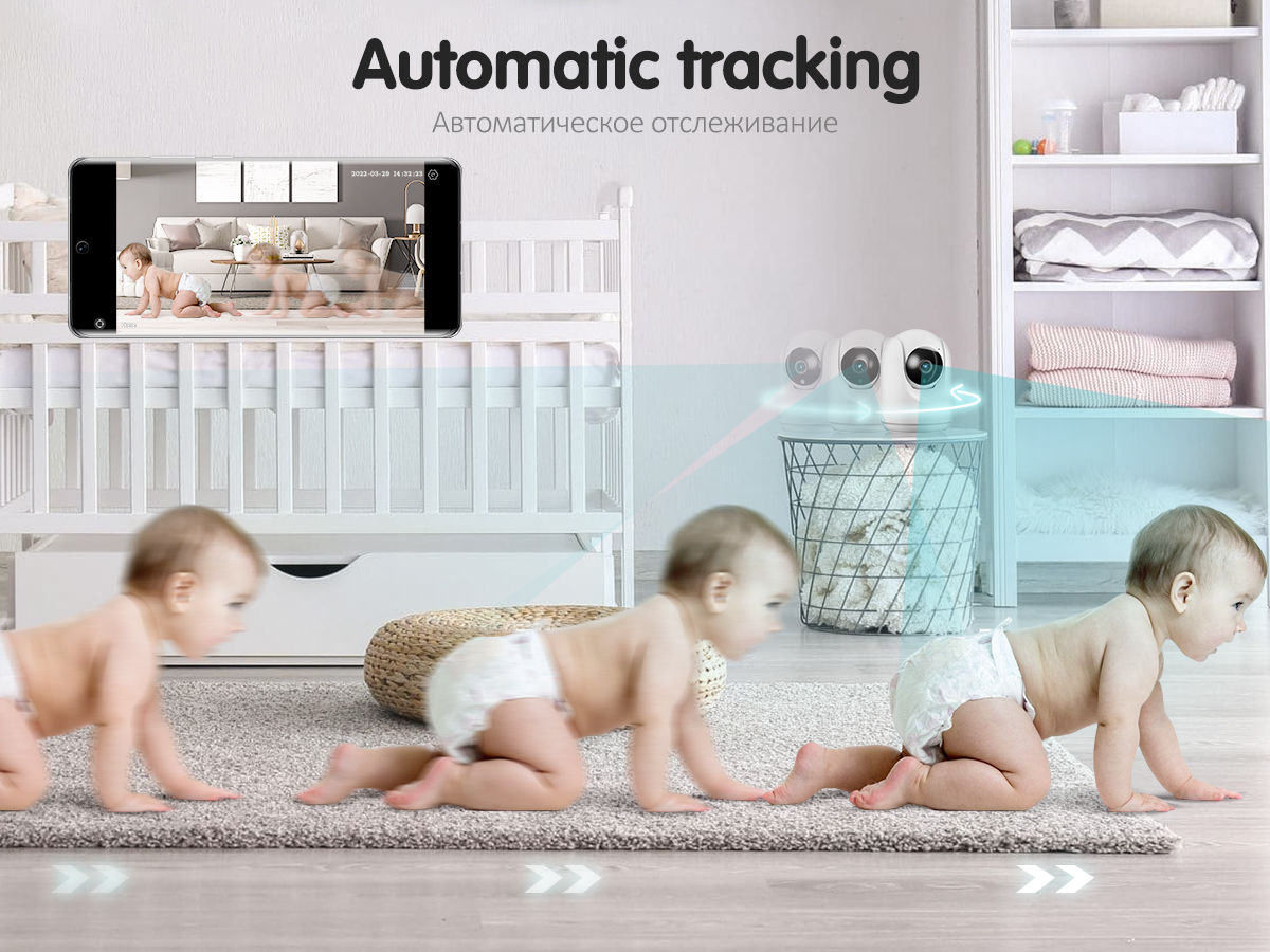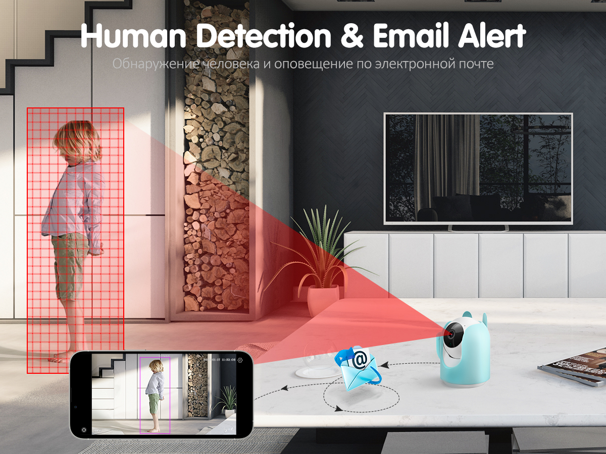 После блокировки цели камера автоматически регулирует вращение панорамирования/наклона для отслеживания движущихся объектов, домашних животных, людей и т. Д. И Push-оповещения по электронной почте или уведомления на ваши смартфоны (iOS, Android).