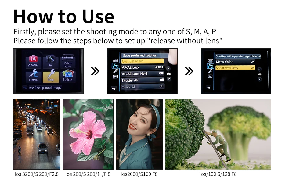 Это РУЧНОЙ объектив с простым фокусным значением, что означает, что он НЕ будет выполнять АВТО-ФОКУС. В пользовательской настройке на камере есть опция под названием «выпуск без объектива», которая должна быть установлена в положение «ON», чтобы Камера могла делать снимки с ручными объективами.