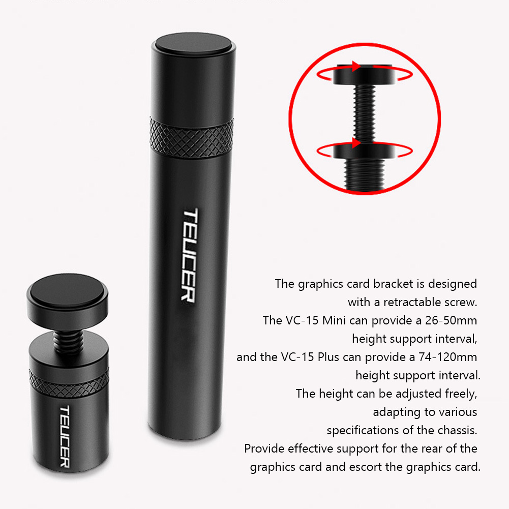 Кронштейн видеокарты разработан с выдвижным винтом. VC-15 Mini может обеспечить интервал поддержки высоты 26-50 мм, а VC-15 Plus может обеспечить интервал поддержки высоты 74-120 мм. Высоту можно свободно регулировать, адаптируясь к различным спецификациям шасси. Обеспечивают эффективную поддержку задней части видеокарты и сопровождают видеокарту.