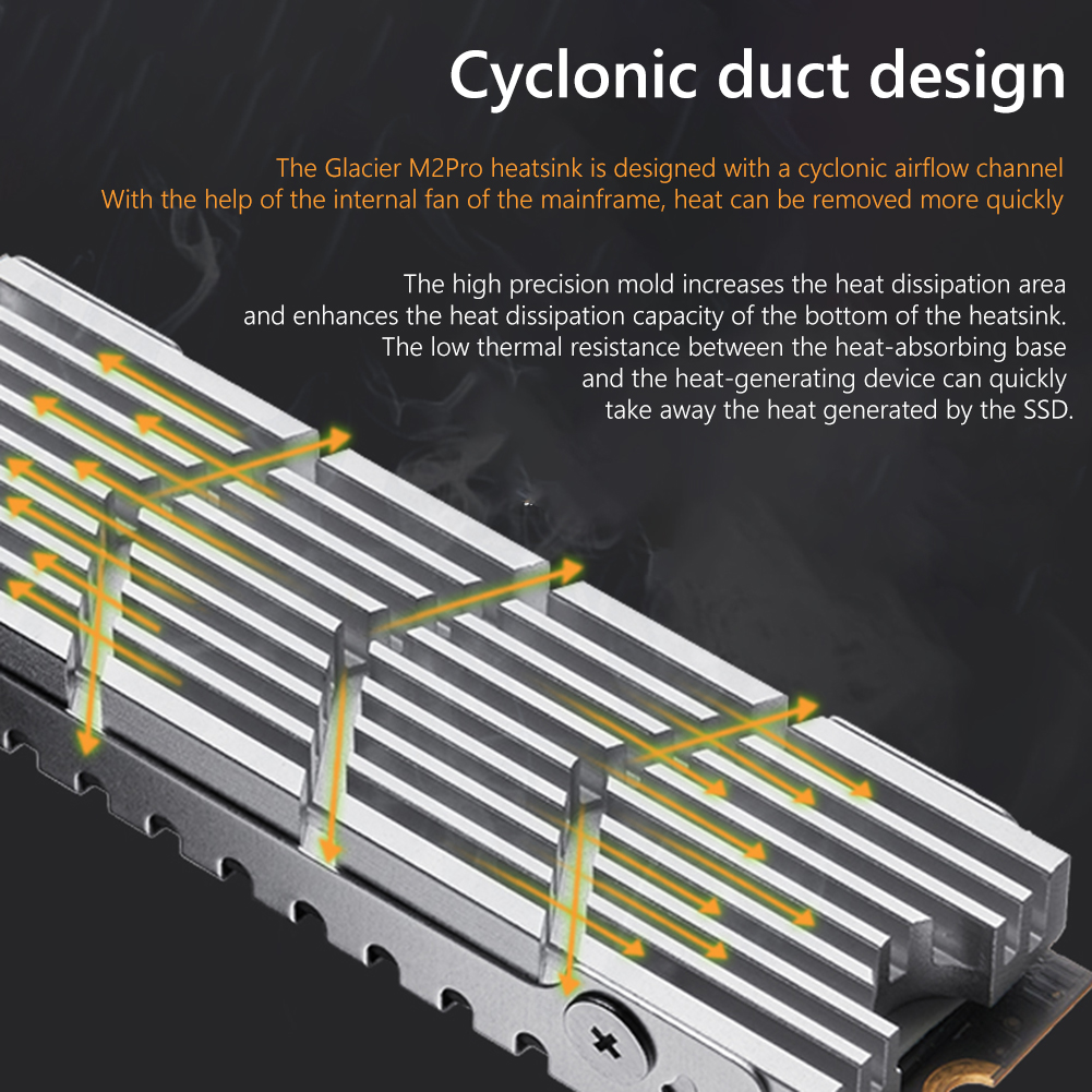 2. Инновационная конструкция спирального воздушного потока:Для Glacier M2 Pro используется спиральная конструкция воздушного потока для эффективного отвода тепла с помощью внутреннего вентилятора. Увеличенная площадь рассеивания тепла, достигаемая за счет высокоточных форм, увеличивает охлаждающую способность в нижней части радиатора. Эта уникальная система воздушного потока сводит к минимуму тепловое сопротивление между теплопоглощающим основанием и твердотельным накопителем, эффективно рассеивая тепло, выделяемое во время работы.