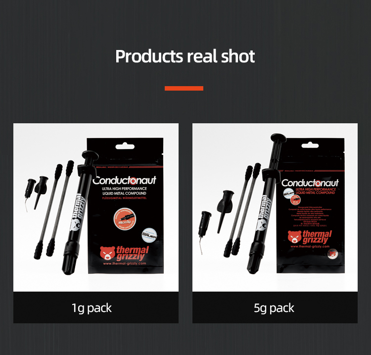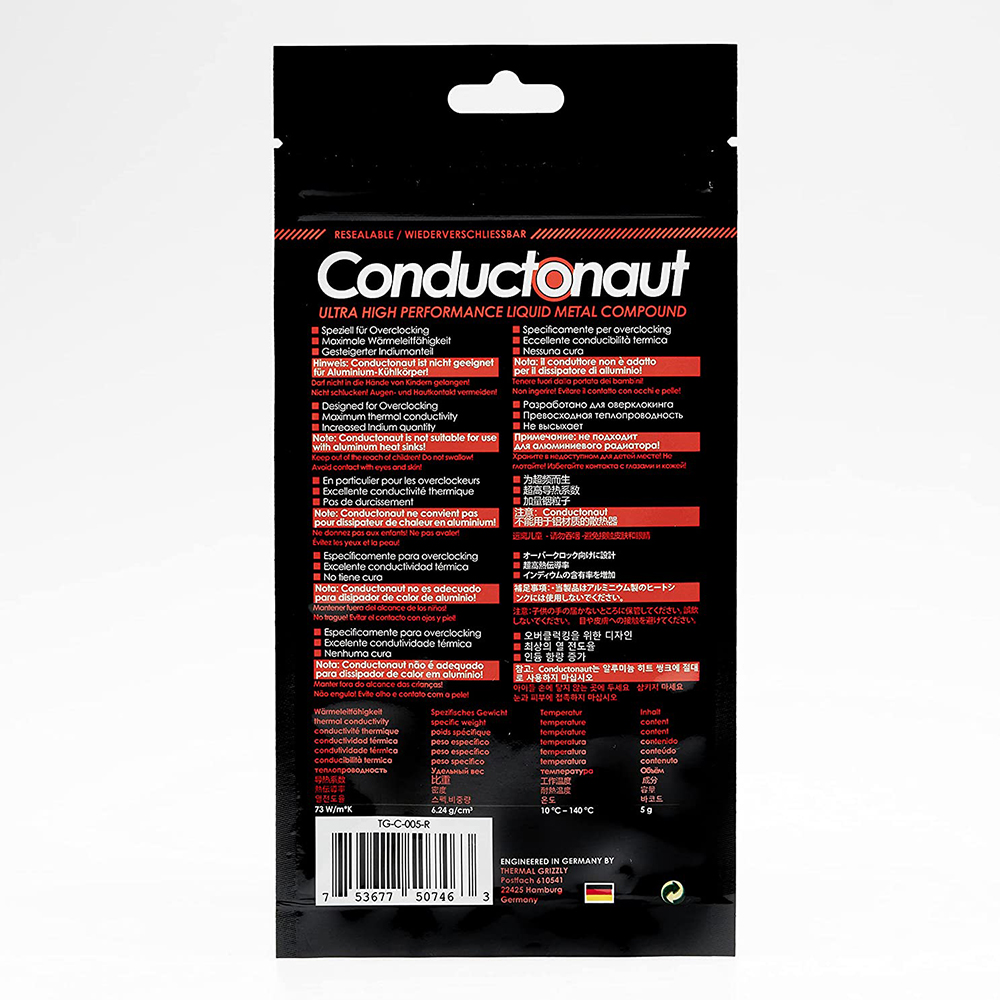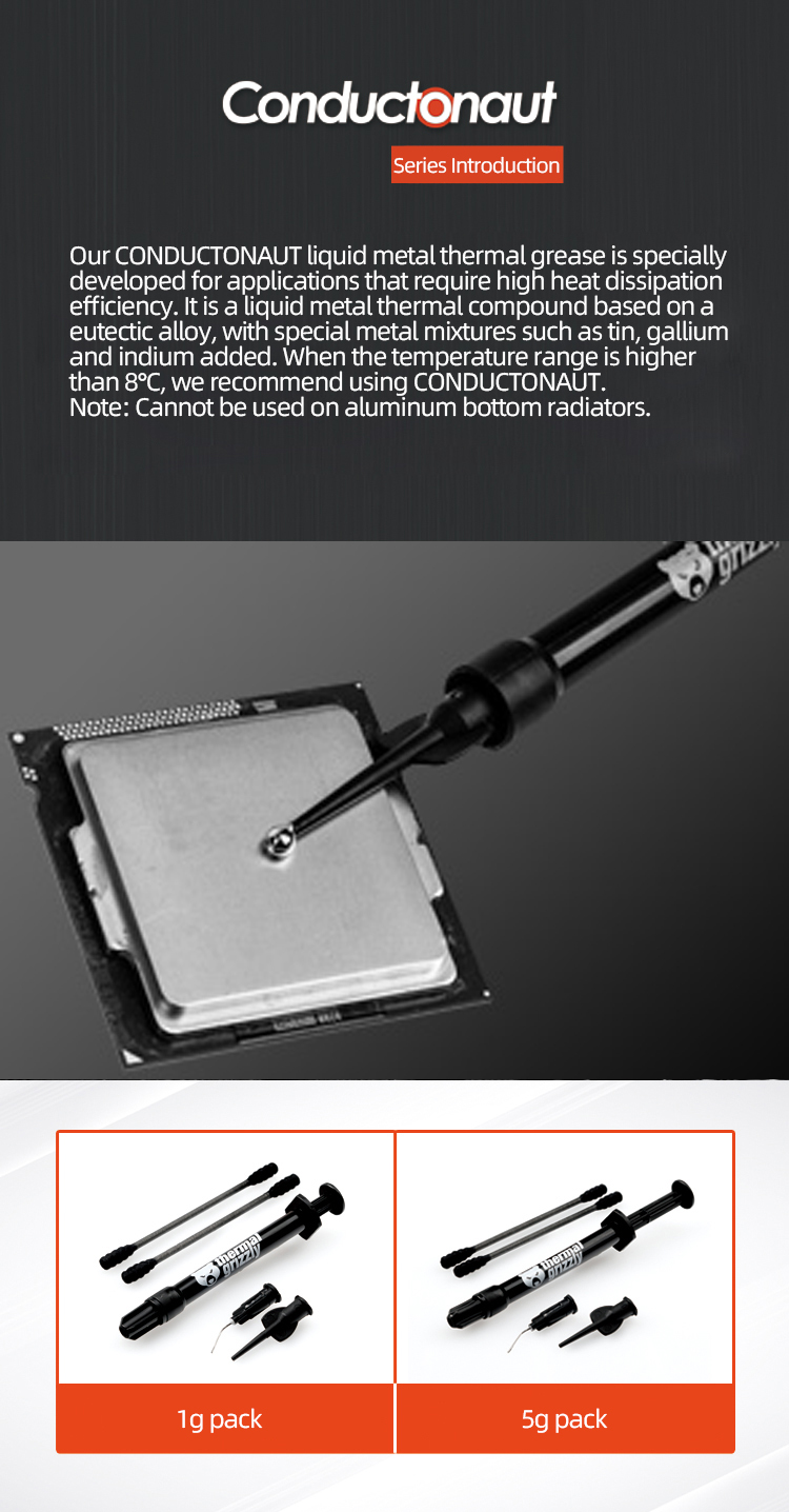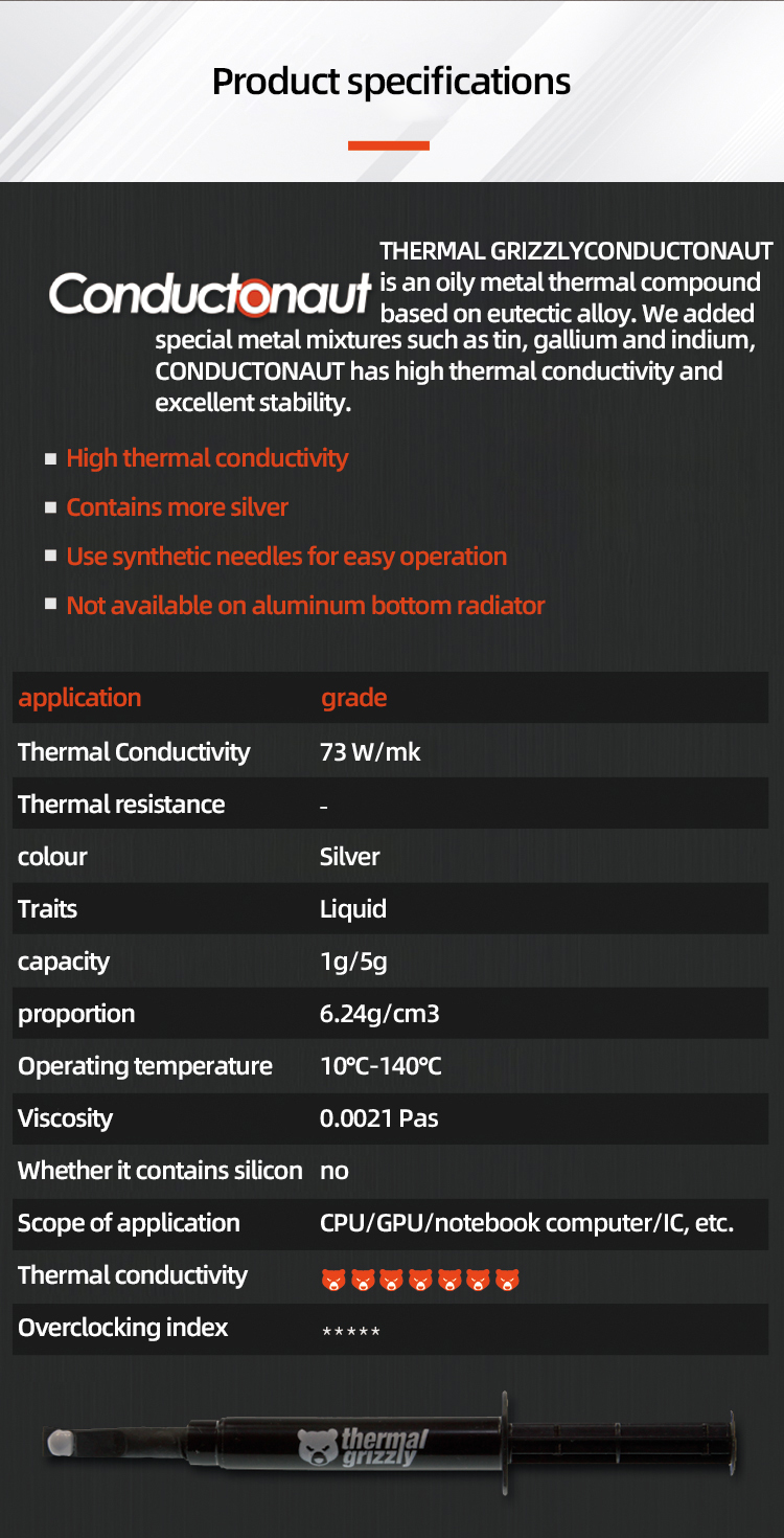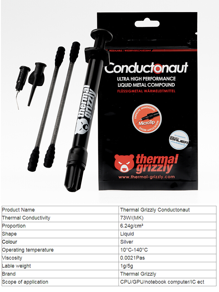 Термальный Grizzly Conductonaut представляет собой жидкое металлическое термальное соединение на основе эвтектического сплава. Наша специальная смесь металлов, таких как олово, Галлий и индий, проводимость превосходит очень высокую теплопроводность.