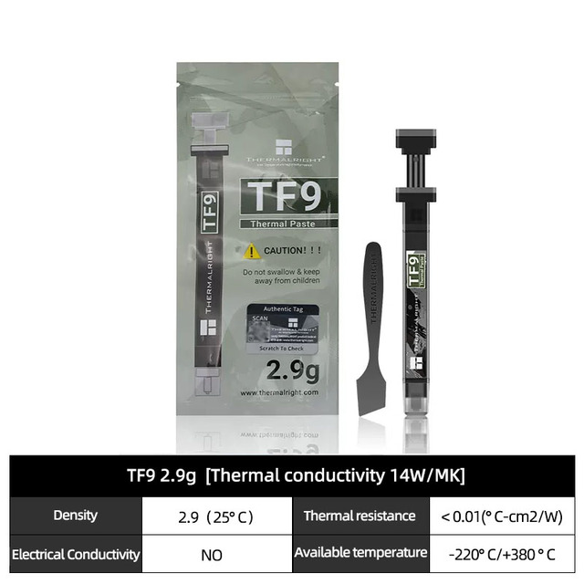 Термоправая термопаста TF9 1,5/2,9 г, 14 Вт/м. K, охлаждающая паста для ЦП/ГП для компьютера, ноутбука, графической карты, охлаждающая паста со скребком
