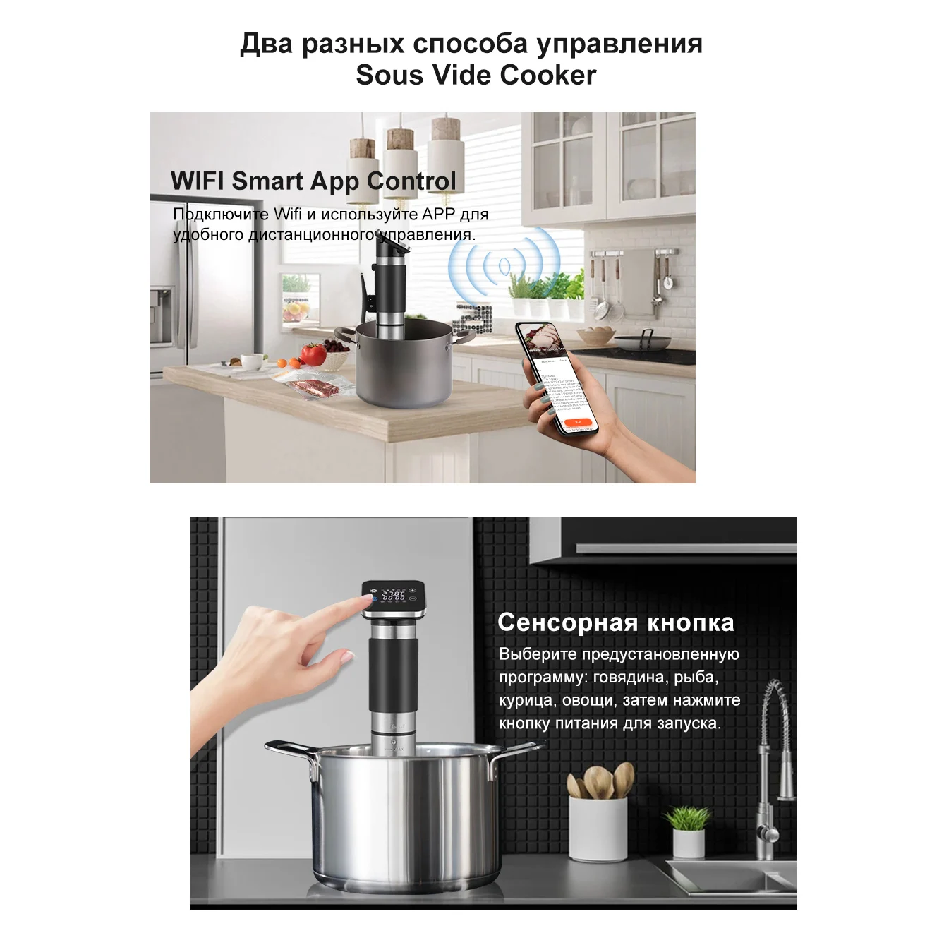 Два способа работы: сенсорная кнопка с 4 предустановками (стейк/рыба/курица/овощи) или пульт дистанционного управления через мобильное приложение операции: вы можете управлять цифровой медленной плитой, прикоснувшись к умной панели управления, или сделайте sous vide работать с приложением «Tuya smart». Вы можете загрузить приложение в Google Play или в App Store для Wi-Fi подключения, Используйте приложение на вашем телефоне для управления точной плитой.