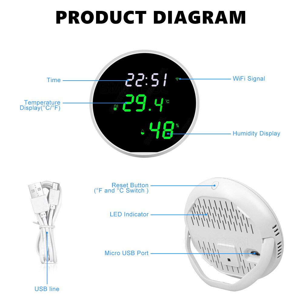 Датчик использует источник питания USB. По сравнению с аккумуляторной версией датчик будет контролировать температуру и влажность в режиме реального времени. Датчик сообщит, когда температура и влажность изменятся очень незначительно. Вы можете просмотреть изменения значения в приложении или на экране дисплея. Запишите изменения температуры и влажности в приложении и используйте графику, чтобы показать вам.