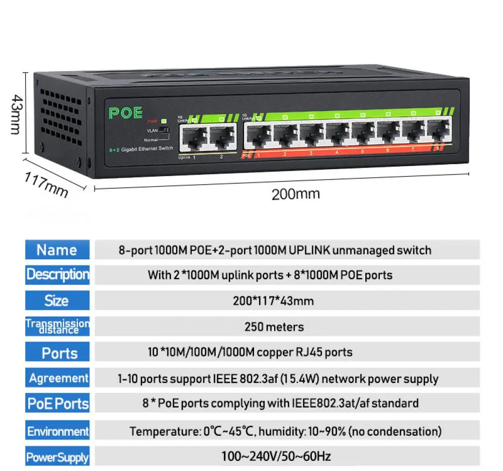 Коммутатор POE-это Неуправляемый коммутатор PoE, который обеспечивает 10 адаптивных портов RJ45. 100/1000 Мбит/с.