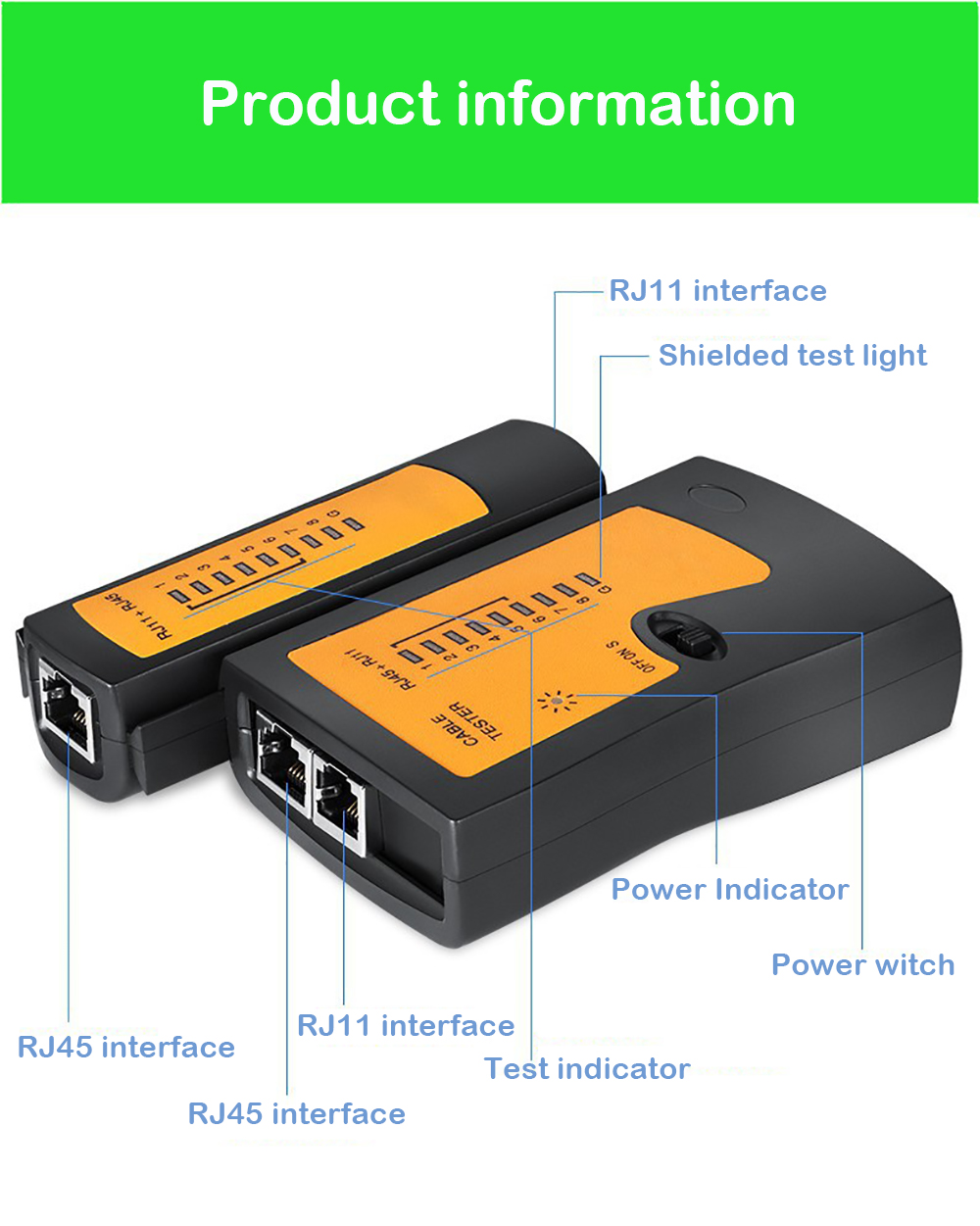 If test patch panels or wall plate outlels, two cables which can match each other (RJ45) will be connected to the tester.
