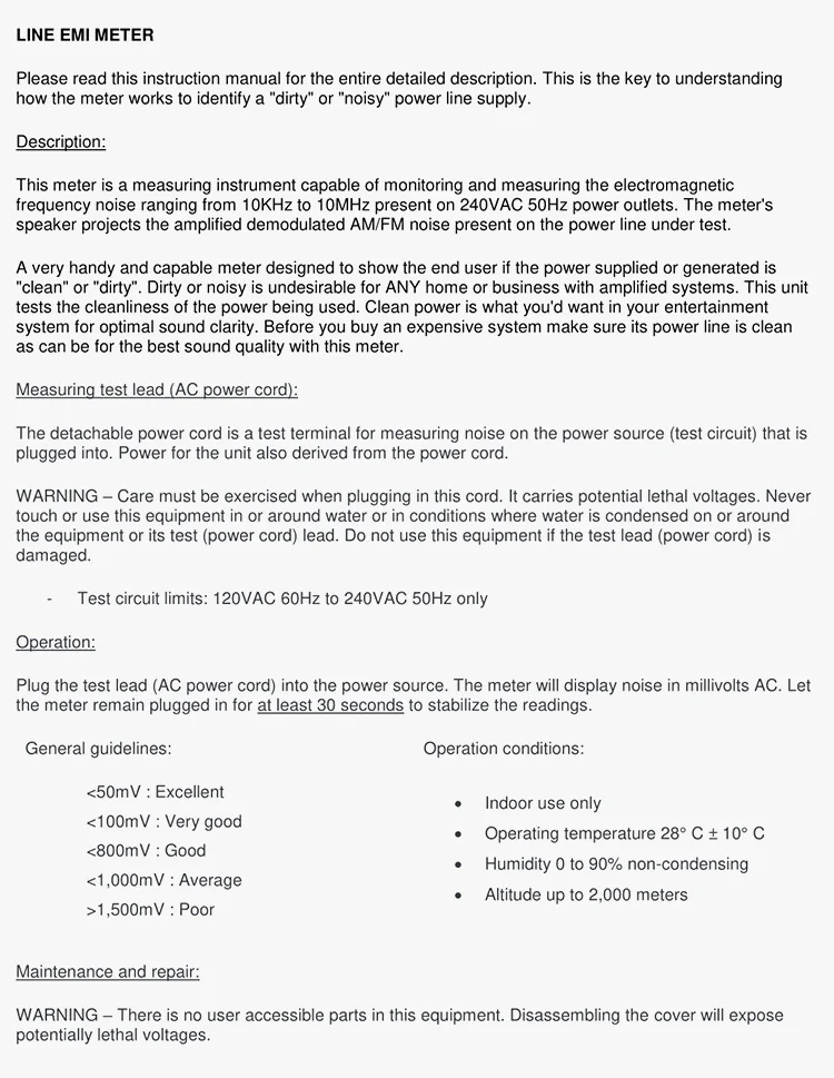 Динамик воспроизводит звуки электромагнитных помех, а амплитуды демодулируются для идентификации источников электромагнитных помех (таких как AM или коротковолновые радиостанции, двигатели и дуги).