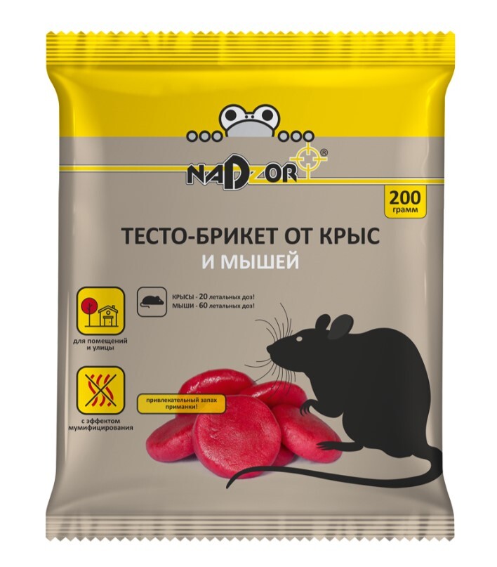 Тесто-брикеты имитируют растительную и животную пищу, чем и привлекают крыс. Мягкая масса в виде теста, содержащая Активное действующее вещество и комплекс привлекателей, упакована в индивидуальные пакетики из фильтр-бумаги которые позволяют легко дозировать приманку и не