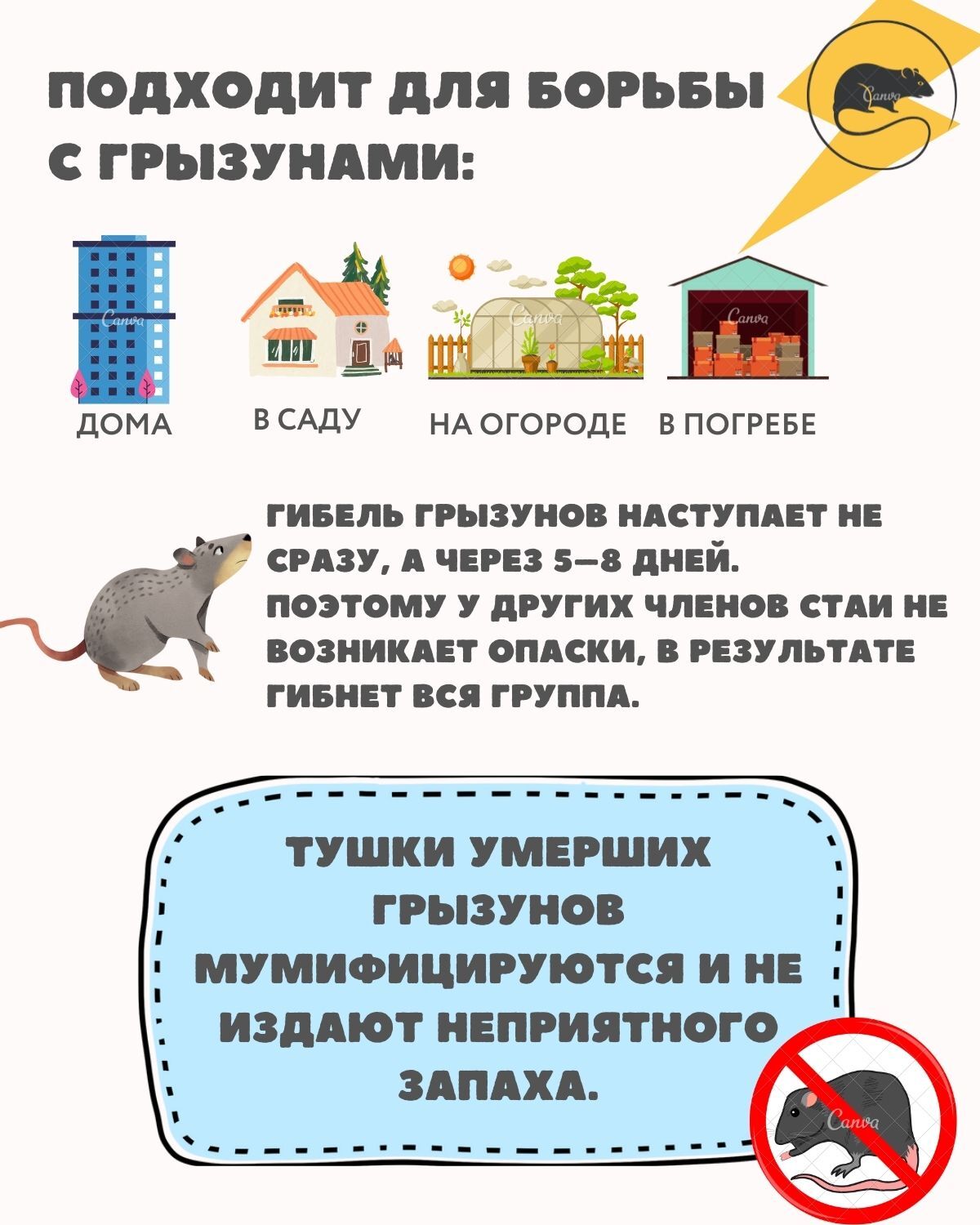 Поэтому у других членов стаи не возникает опаски, в результате гибнет вся группа. Тушки умерших грызунов мумифицируются и не издают неприятного запаха.Препарат удобен при раскладке.