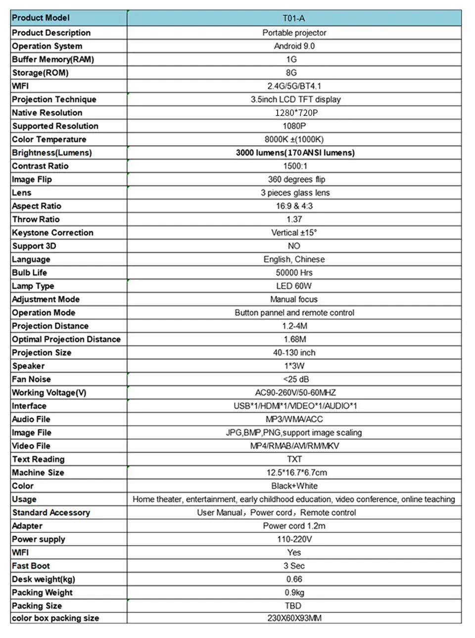 Tflag T01A проектор 4K мини Android Wi-Fi Bluetooth портативный видеопроектор 1 + 8 ГБ ЖК-дисплей 170Ansi