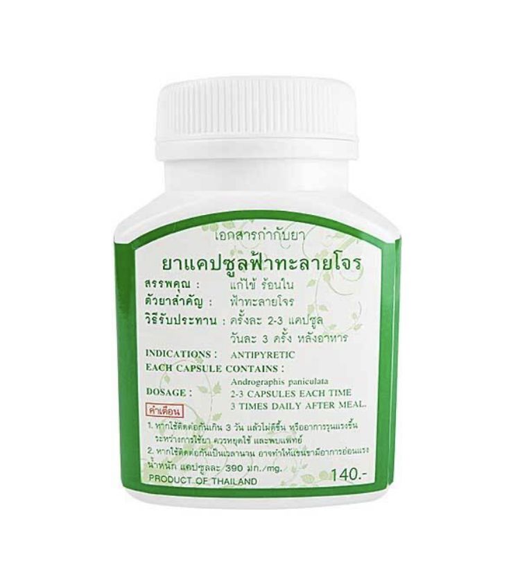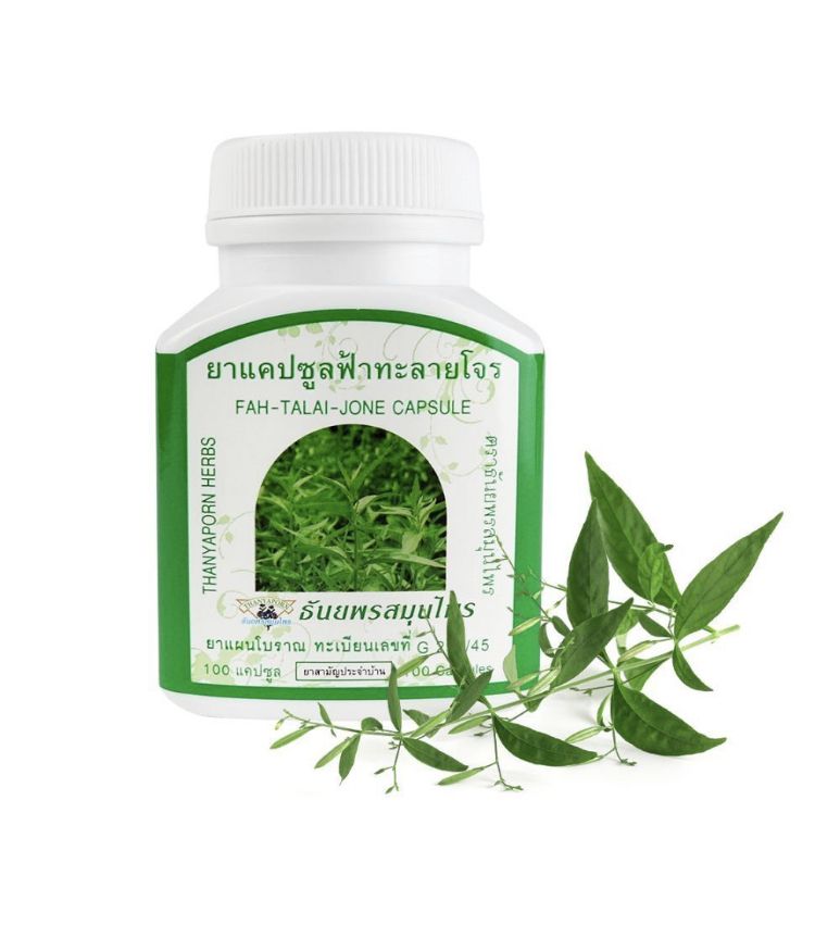 Описание: Fah Talai Jone (Andrographis paniculata) - народное тайское средство для укрепления и повышения тонуса организма. Полностью натуральный продукт, тайские травяные аутентичные прессованные таблетки фабричного производства на основе лекарственного растения Андрографис. Продукт полностью натуральный не будет нарушать вашу микрофлору кишечника. Часто применяется для профилактики простудных и инфекционных осложнений. Многие россияне побывавшие в странах Азии и особенно в Таиланде не понаслышке знают широко распростаненное  средство Фа Талай Джон, которое  им в первую очередь предлагали в тайских магазинах. Биологический состав товара Фа-Талай-Джон: Для его изготовления используют исключительно высушенные листья Андрографиса метельчатого. Противопоказания: индивидуальная непереносимость компонентов беременность, период лактации и планируемая беременность.