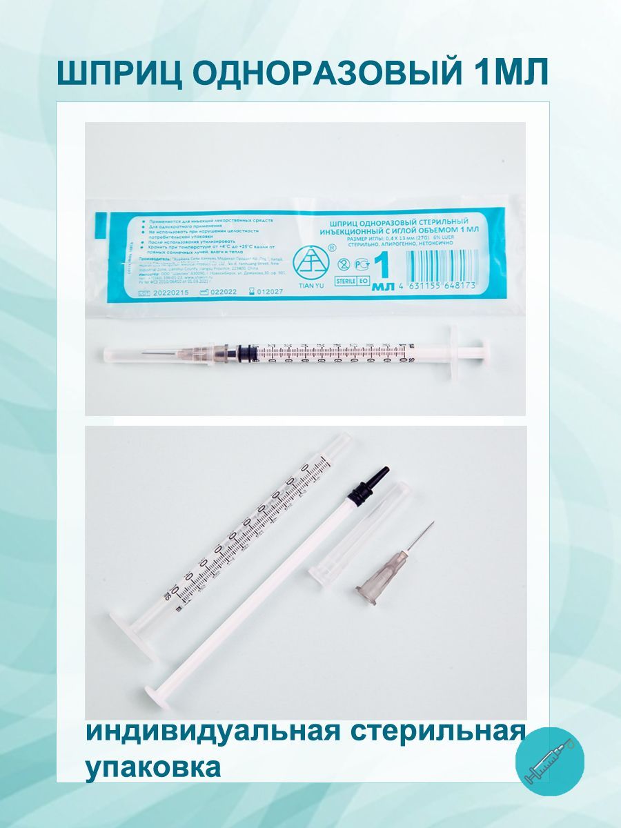 TIAN YU / Шприц инсулиновый 1 мл 50шт U-100 3PC, с иглой 27G 0,4х13мм, одноразовый медицинский с иглой для инъекций, шприц инъекционный трехкомпонентный
