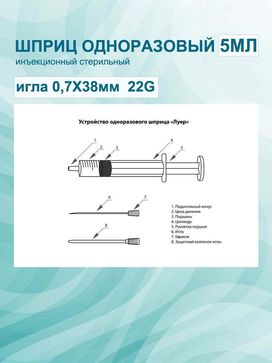 Описание: Шприцы инъекционные 3-х компонентные однократного применения стерильный объемом 5 мл с наконечником концентрического типа соответствуют международному стандарту ISO 7886-1.