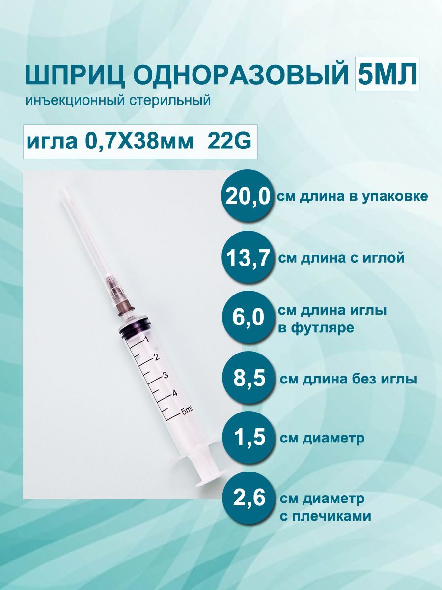 TIAN YU / Шприц медицинский 5 мл 20 шт 3РС, с иглой 0,7х38мм 22G, стерильный трехкомпонентный одноразовый для уколов и инъекций