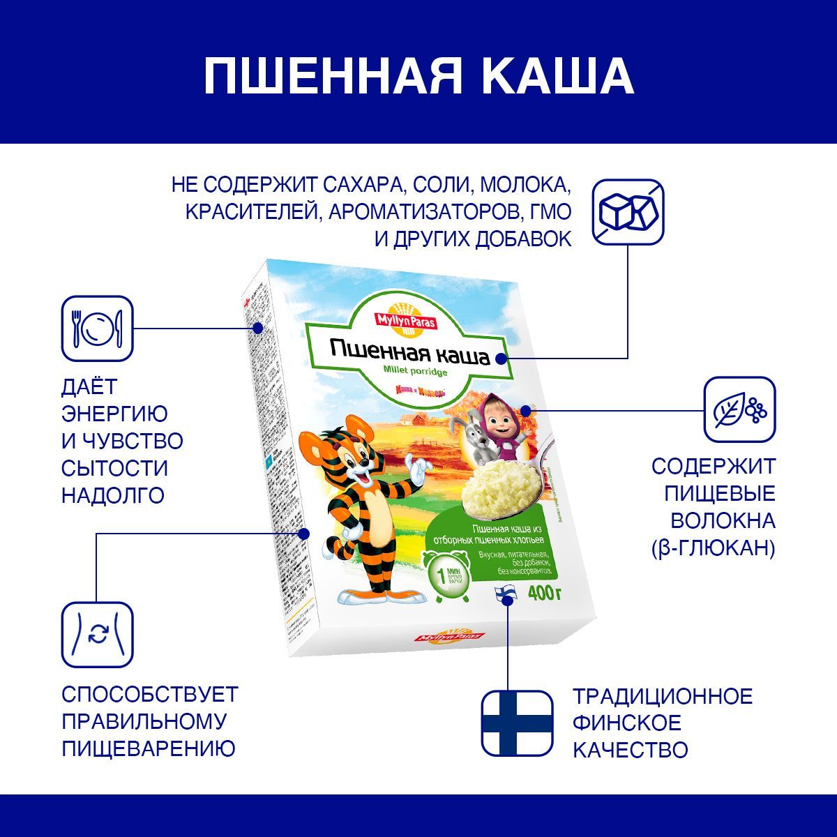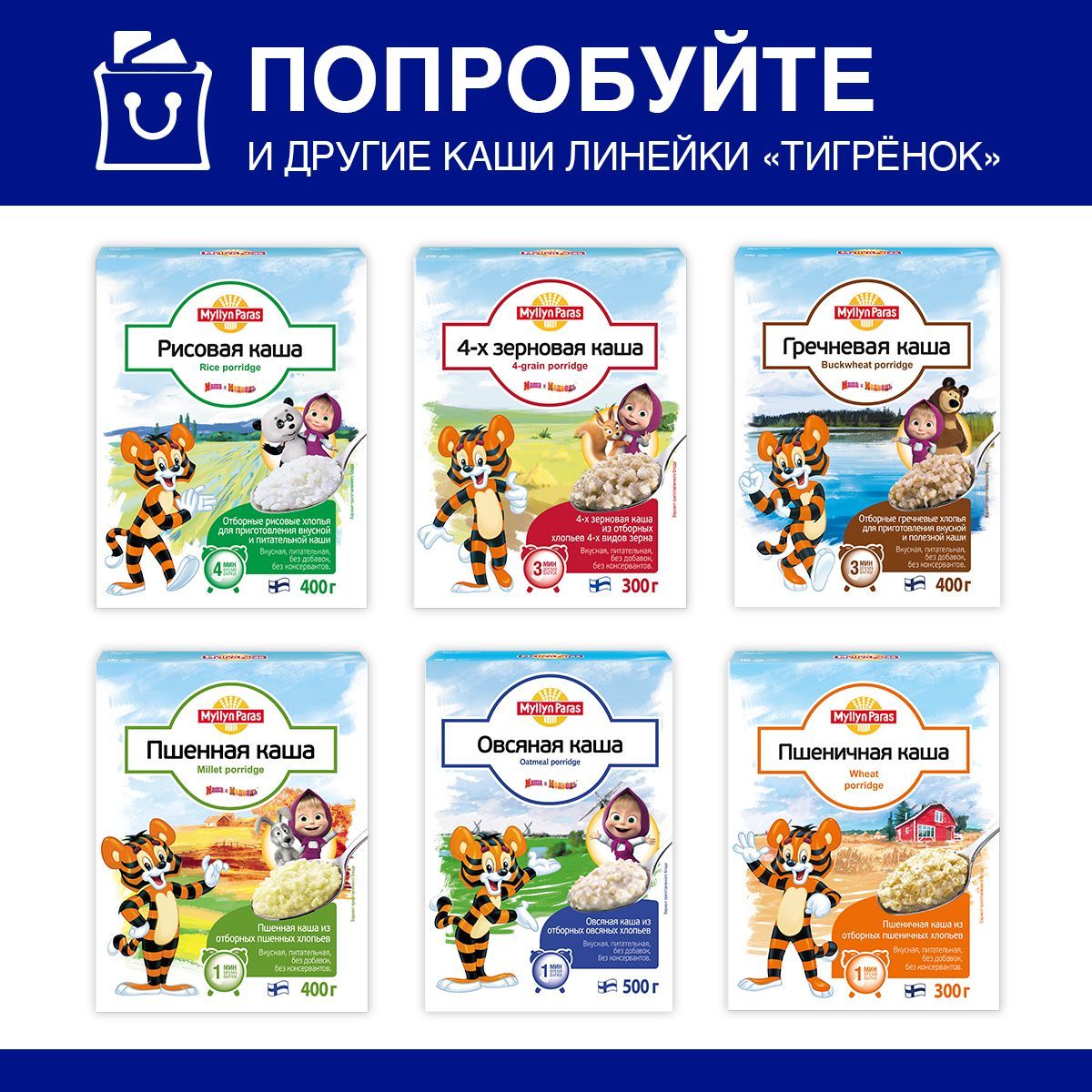 Из пшенных хлопьев варят вкусную и питательную кашу, которую дети называют "каша с тигренком". Очень нравятся деткам, ведь каша получается нежной и просто тает во рту. Веселый Тигренок и герои мультфильма "Маша и Медведь" сделают завтрак любимым занятием для малыша. Кушать кашу он будет с удовольствием. Каша "Тигренок" Myllyn Paras обязательно должна быть в вашем здоровом меню.