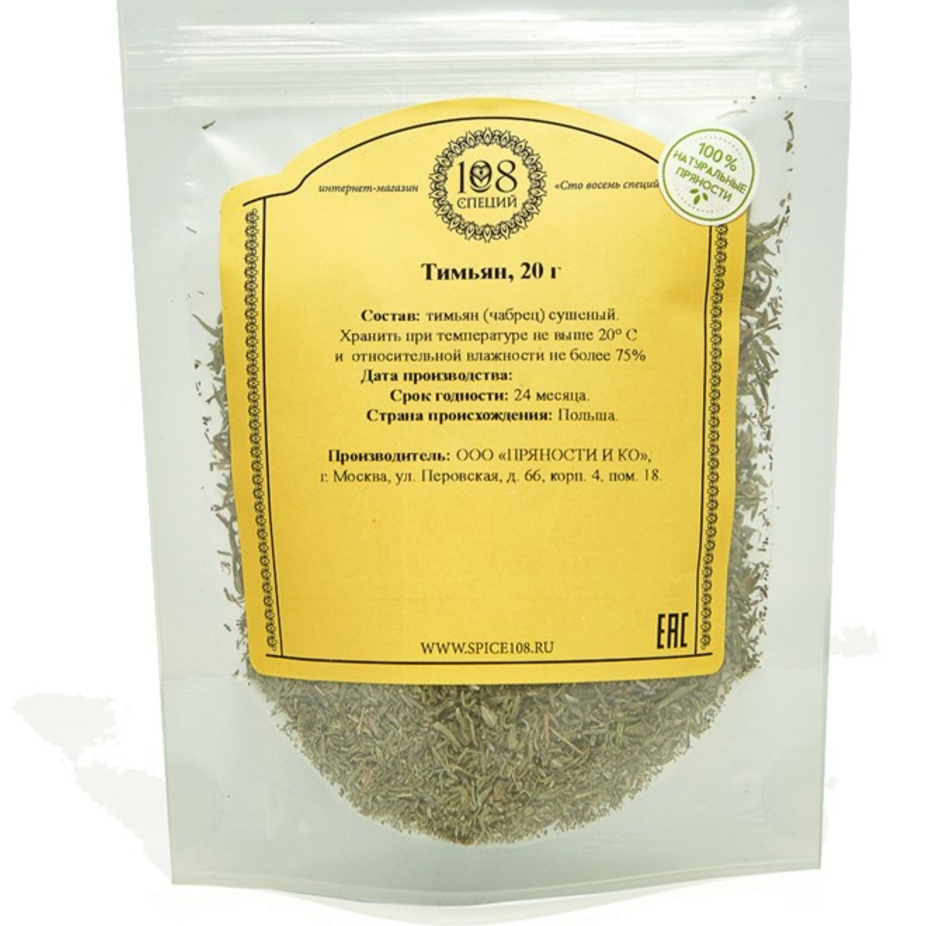 Тимьян чабрец сушеный резаные листья и стебли, высший сорт 108 специй дой-пак, 20 г, приправа для мяса и рыбы, пиццы и салатов, специя для успокаивающего чая