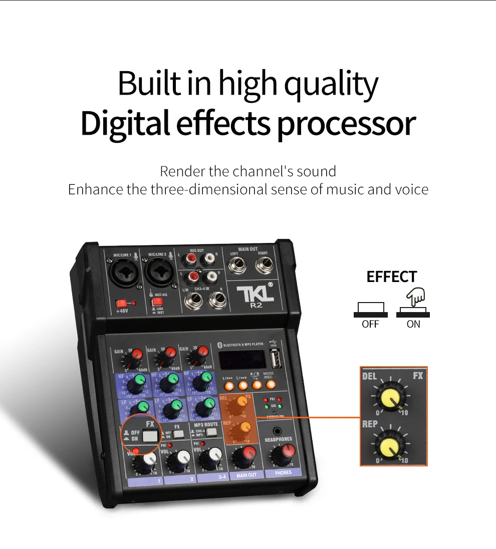 • Встроенный эффект реверберации, путем регулировки ручки для регулировки глубины реверберации и эффекта задержки.