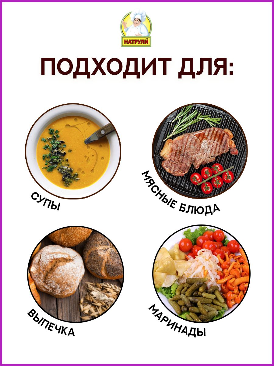 Назначение приправы: Для барбекю, Для блюд из картофеля, Для блюд на гриле, Для вок-блюд, Для выпечки и кондитерских изделий, Для жаркого, Для консервирования, Для копчения, Для курицы, Для лазаньи, Для маринада, Для мясных блюд, Для овощей, Для пивоварения, Для плова, Для птицы, Для риса, макарон и пиццы, Для рыбы и морепродуктов, Для салатов, Для свинины, Для соусов, Для супов