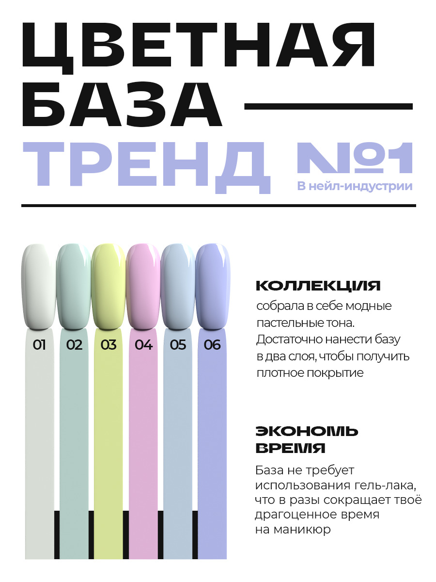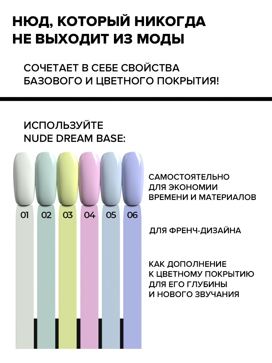 В коллекции представлены трендовые нюдовые оттенки для обворожительного маникюра. База идеально наносится на ногтевую пластину благодаря своей высокой вязкости, мгновенно самовыравнивается, не затекает на кутикулу и боковые валики.