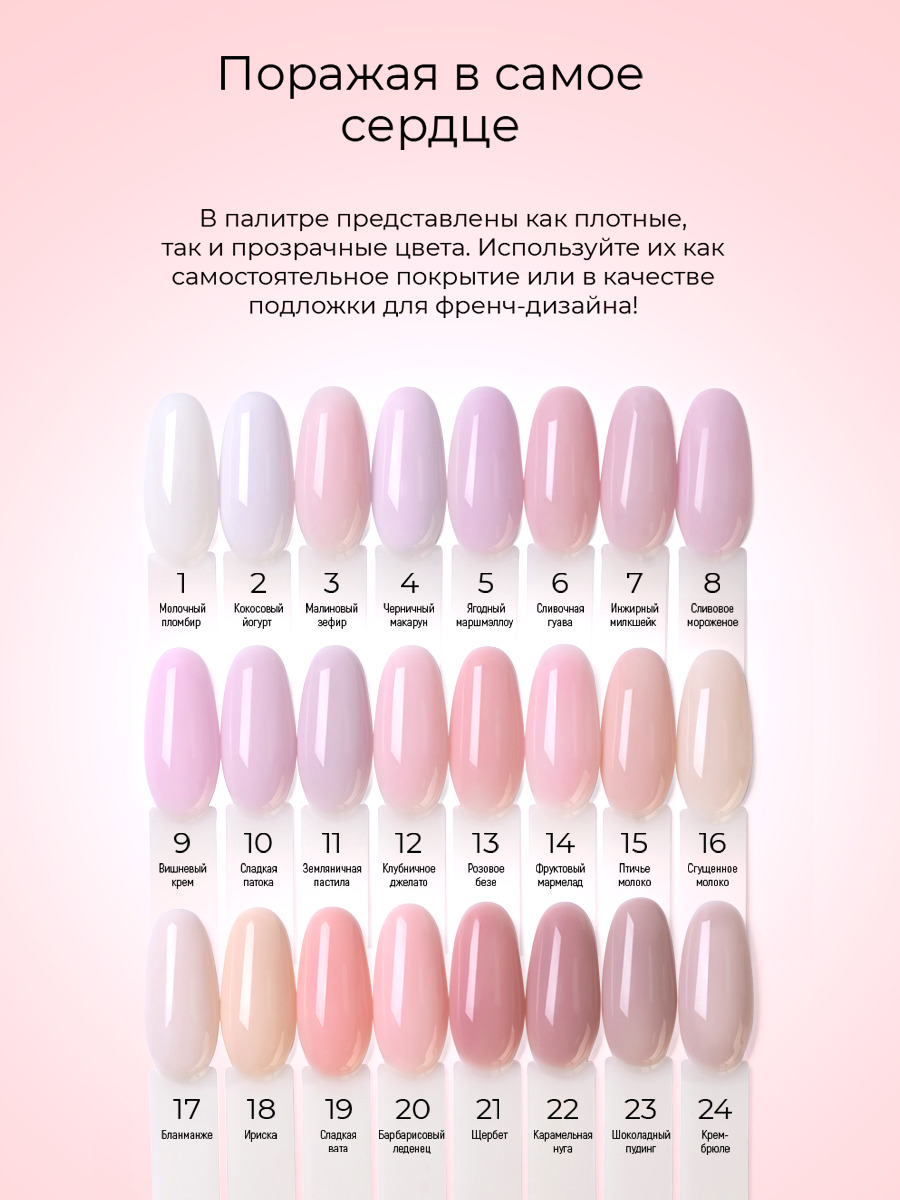 В серии камуфляжей 24 нежных легких нюдовых оттенка, которые позволят создать естественное покрытие Вашей мечты. Крем-брюле, Птичье молоко, Розовое безе, Кокосовый йогурт - эти и другие оттенки новой коллекции от TNL созданы, чтобы поражать в самое сердце. В палитре представлены как плотные, так и прозрачные цвета. Можно использовать как самостоятельное покрытие или в качестве подложки для френч дизайна (французский маникюр). Экономичный расход - более 40 процедур маникюра с одной банки гель-лака. Безупречный цвет с первого слоя. Средняя вязкость покрытия не позволяет гель-лаку растекаться по ногтевой пластине. У гель-лака максимально безопасный состав и формула 9 Free.