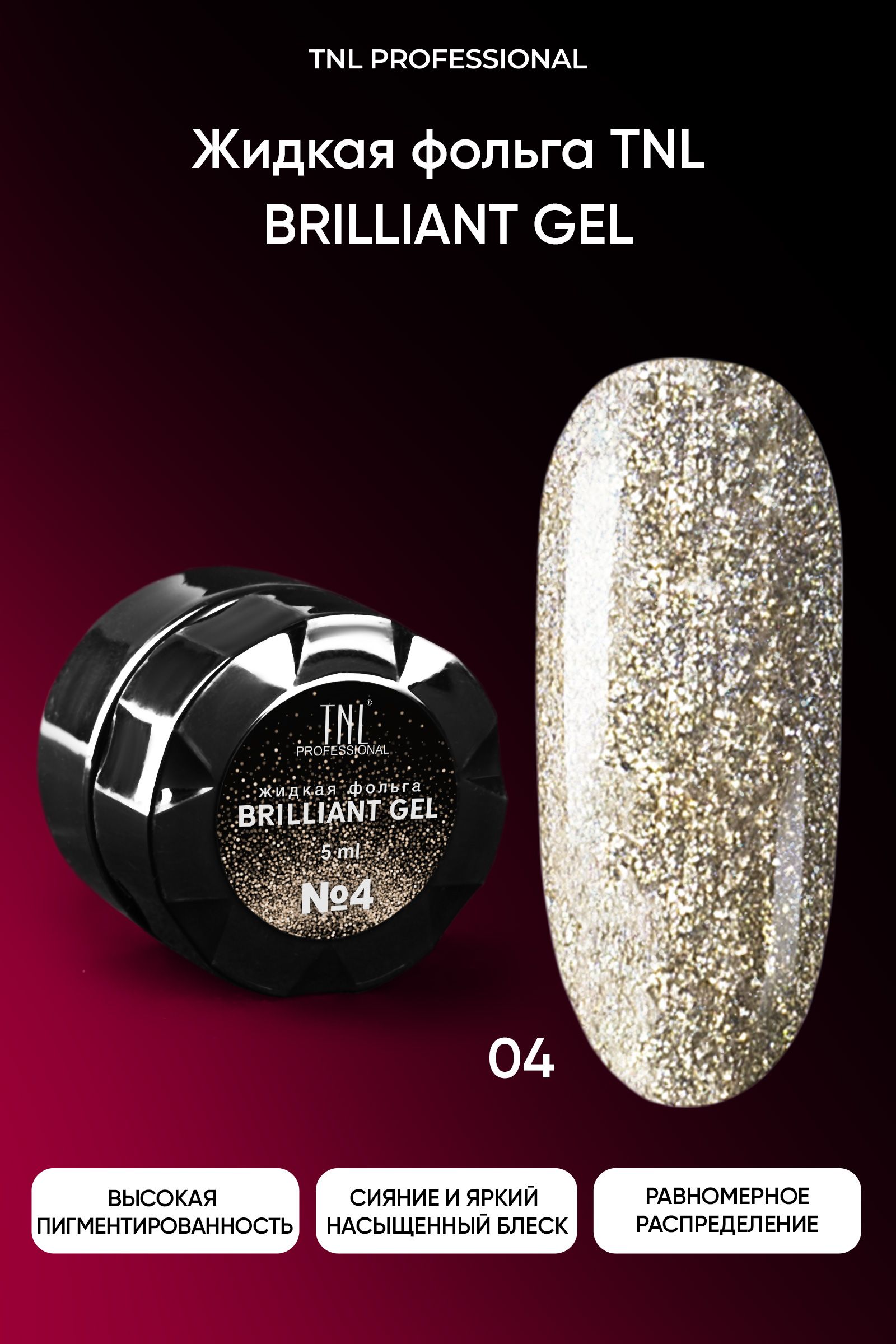 Описание: Жидкая фольга TNL – это смесь металлической слюды и блесток в прозрачной базе, которые дают сногсшибательное мерцание вашим ноготкам. ДОСТОИНСТВА: Она имеет мягкую текстуру, что обеспечивает равномерное распределение материала по всей ногтевой пластине. Светоотражающие частицы в составе придают маникюру восхитительное сияние и яркий насыщенный блеск. РЕЗУЛЬТАТ: вы приобретаете качественный продукт, который дарит ноготкам потрясающую красоту. Жидкая фольга придаст вашим ногтям яркий маникюр с металлическим блеском, который не оставит равнодушной ни одну модницу.