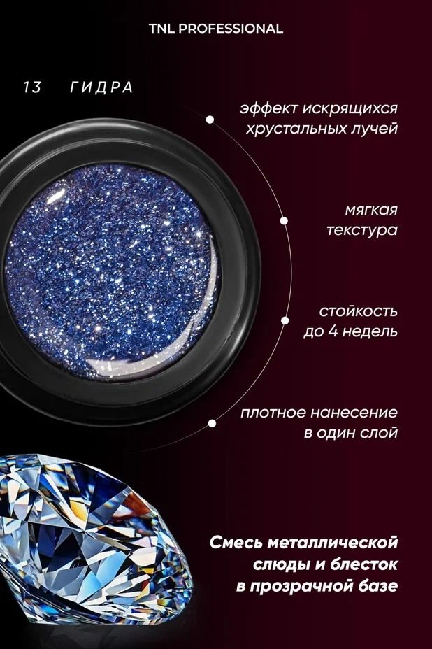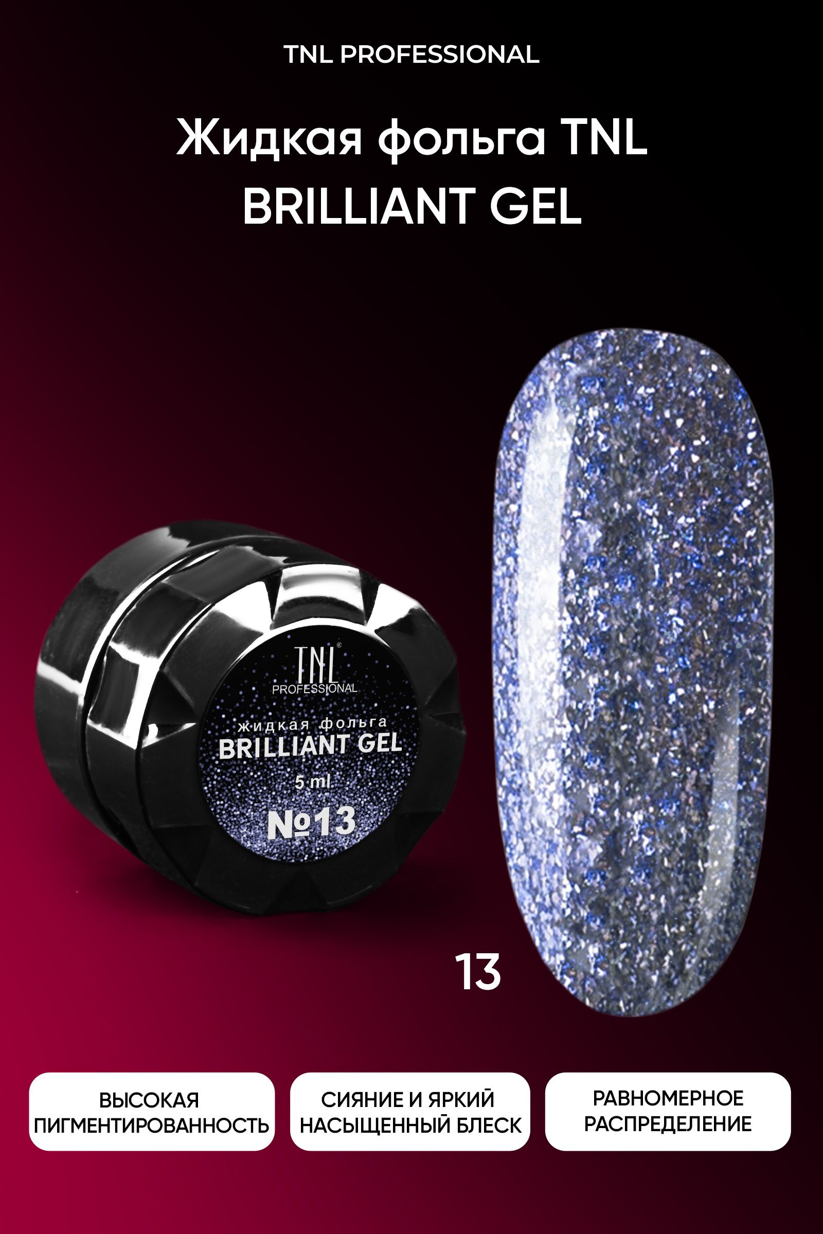 Описание: Жидкая фольга TNL – это смесь металлической слюды и блесток в прозрачной базе, которые дают сногсшибательное мерцание вашим ноготкам. ДОСТОИНСТВА: Она имеет мягкую текстуру, что обеспечивает равномерное распределение материала по всей ногтевой пластине. Светоотражающие частицы в составе придают маникюру восхитительное сияние и яркий насыщенный блеск. РЕЗУЛЬТАТ: вы приобретаете качественный продукт, который дарит ноготкам потрясающую красоту. Жидкая фольга придаст вашим ногтям яркий маникюр с металлическим блеском, который не оставит равнодушной ни одну модницу.