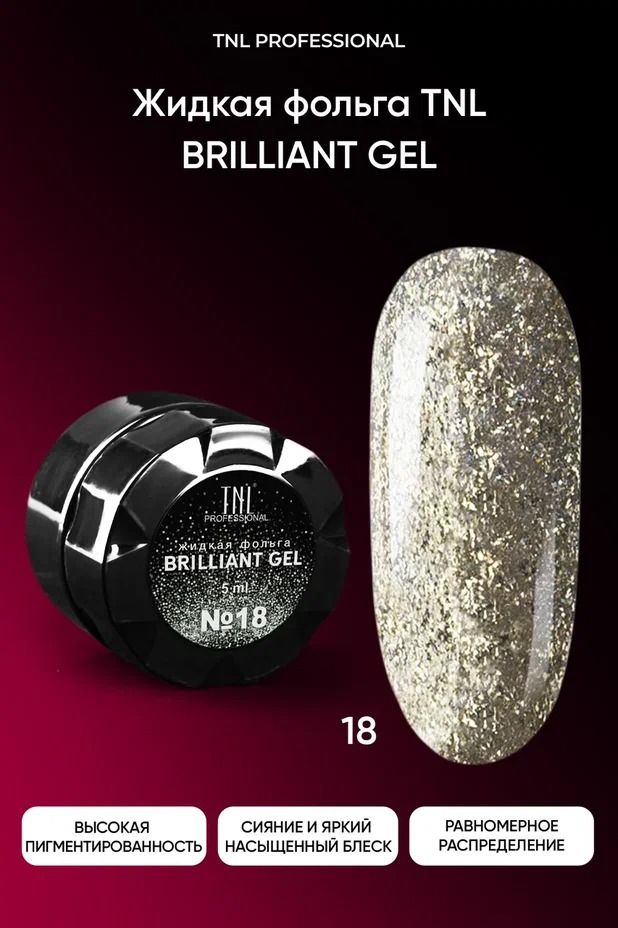 Описание: Жидкая фольга TNL – это смесь металлической слюды и блесток в прозрачной базе, которые дают сногсшибательное мерцание вашим ноготкам. ДОСТОИНСТВА: Она имеет мягкую текстуру, что обеспечивает равномерное распределение материала по всей ногтевой пластине. Светоотражающие частицы в составе придают маникюру восхитительное сияние и яркий насыщенный блеск. РЕЗУЛЬТАТ: вы приобретаете качественный продукт, который дарит ноготкам потрясающую красоту. Жидкая фольга придаст вашим ногтям яркий маникюр с металлическим блеском, который не оставит равнодушной ни одну модницу.