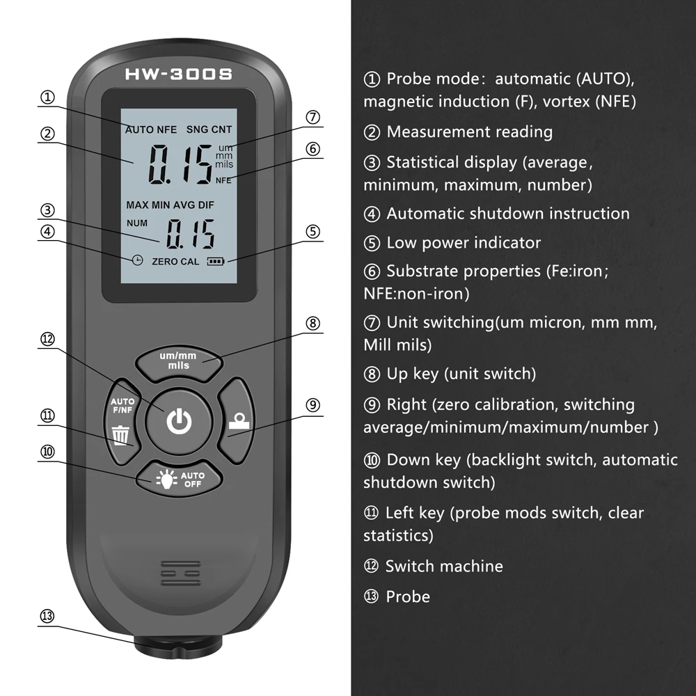 Три режима зонда:Благодаря трем режимам датчика: автоматическому (AUTO) режиму, режиму магнитной индукции (F) и вихревому (NFE), вы можете переключаться в зависимости от ваших потребностей.