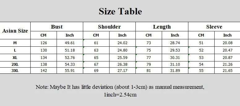 2. Наш Размер одежды в Азии меньше, чем в США и ЕС, например: размер США/ЕС L = Азиатский размер XXL. Пожалуйста, измерьте размер в соответствии с одеждой, которую они обычно носят (не вашим телом), проверьте свой размер с помощью таблицы размеров ниже перед покупкой, если ваше измерение ожидается между двумя размерами, Советуем выбрать самый большой размер. Если она не уверена в размере, пожалуйста, оставьте мне сообщение о ее весе и росте, я могу дать вам предложение.