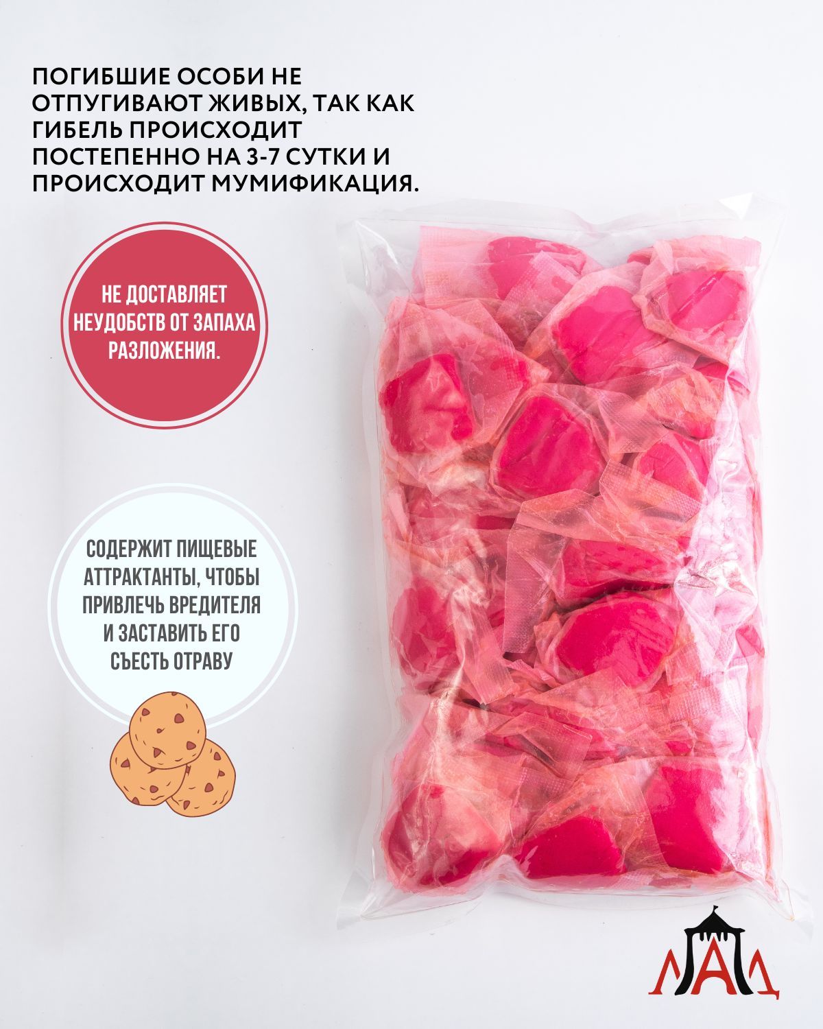 Входящие в состав основы и начинки высококачественные пищевые аттакранты достаточно разнообразны по своим вкусовым свойствам, поэтому легко привлекают грызунов. Поэтому, процесс поедания приманки, после ее раскладки – довольно быстрый. При этом, необходимо раскладывать приманки не большой дозой, а как можно большим количеством мелких доз на пути передвижения грызунов. Чем больше точек расклада, тем эффективнее работает приманка. Гибель серых и черных крыс наступает на 2-11 сутки после поедания 1-3 доз приманки, домовых мышей - на 4-12 сутки после поедания 1-6 доз. Трупы умерших грызунов мумифицируются и не издают неприятного запаха.