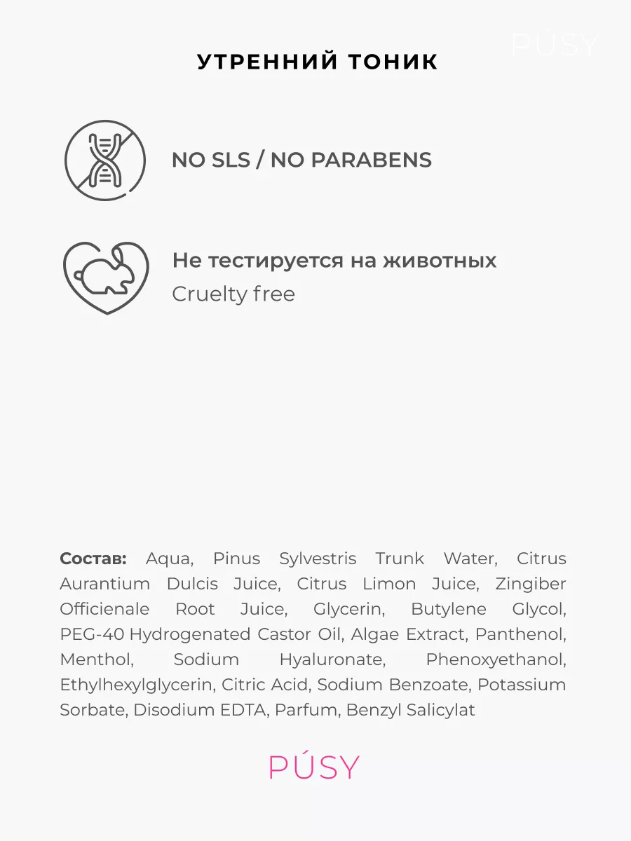 Артикул 105037347 Состав aqua; Pinus Sylvestris Trunk Water; Citrus Aurantium Dulcis Juice; citrus limon juice; Zingiber Officienale Root Juice; Glycerin, Butylene Glycol, PEG-40 Hydrogenated Castor Oil; Algae Extract; Panthenol; Menthol; Sodium Hyaluronate; Phenoxyethanol; Ethylhexylglycerin; Citric Acid; Sodium Benzoate; Potassium Sorbate; Disodium EDTA; Parfum; Benzyl Salicylate.