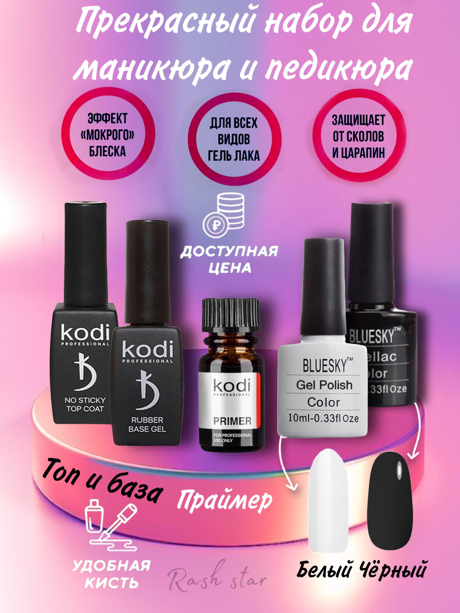 Описание: База Каучуковая Коди Топ Коди без липкого слоя +праймер (кислотный) Коди Каучковая база Kodi, Лаки для ногтей bluesky черный и белый цвет.