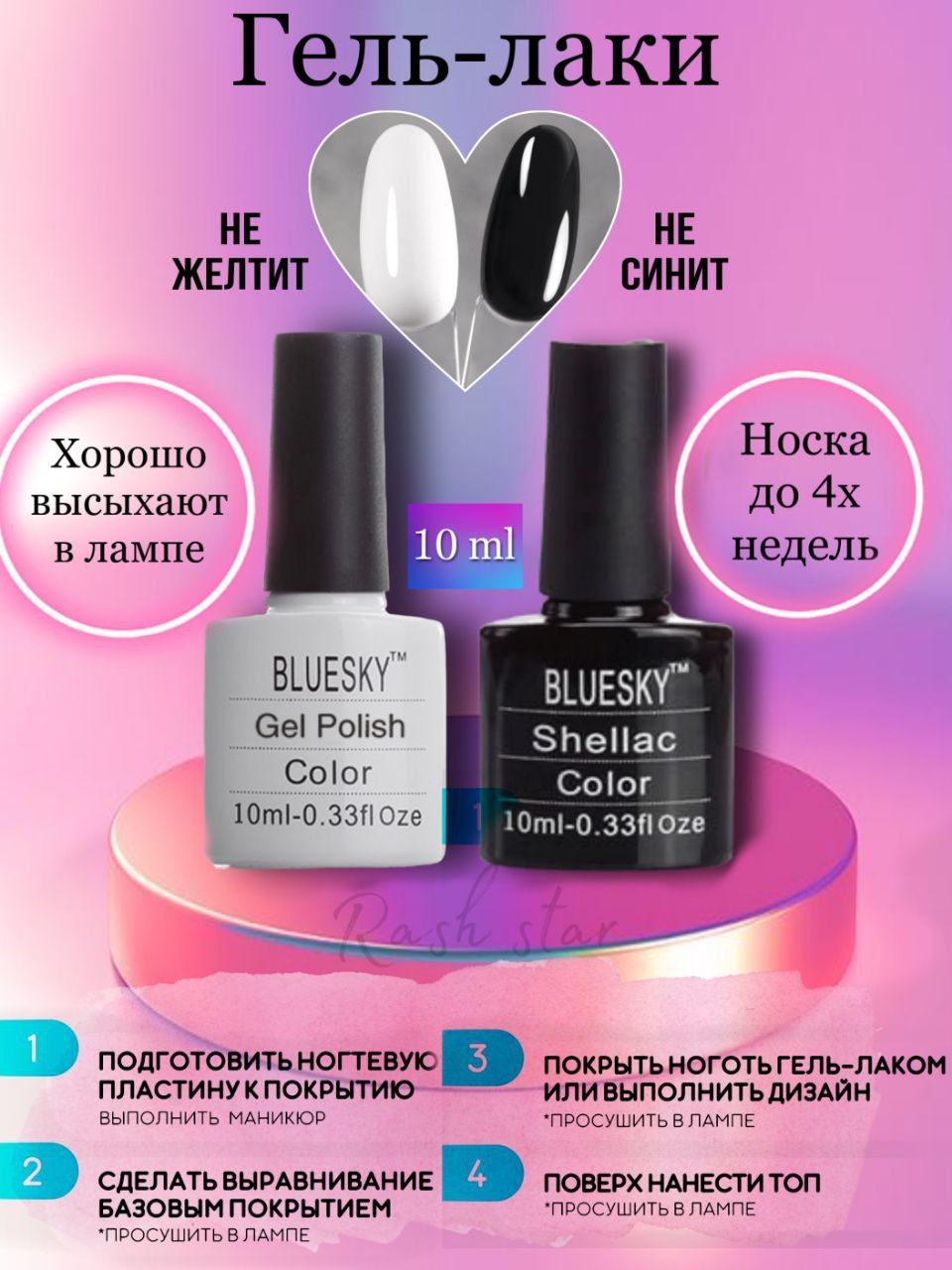 Гель Лаки Bluesky в топовых цветах ( черный и белый)это яркие плотные классические оттенки которые совмещают в себе высокое качество, красивый дизайн и наносятся в два слоя
