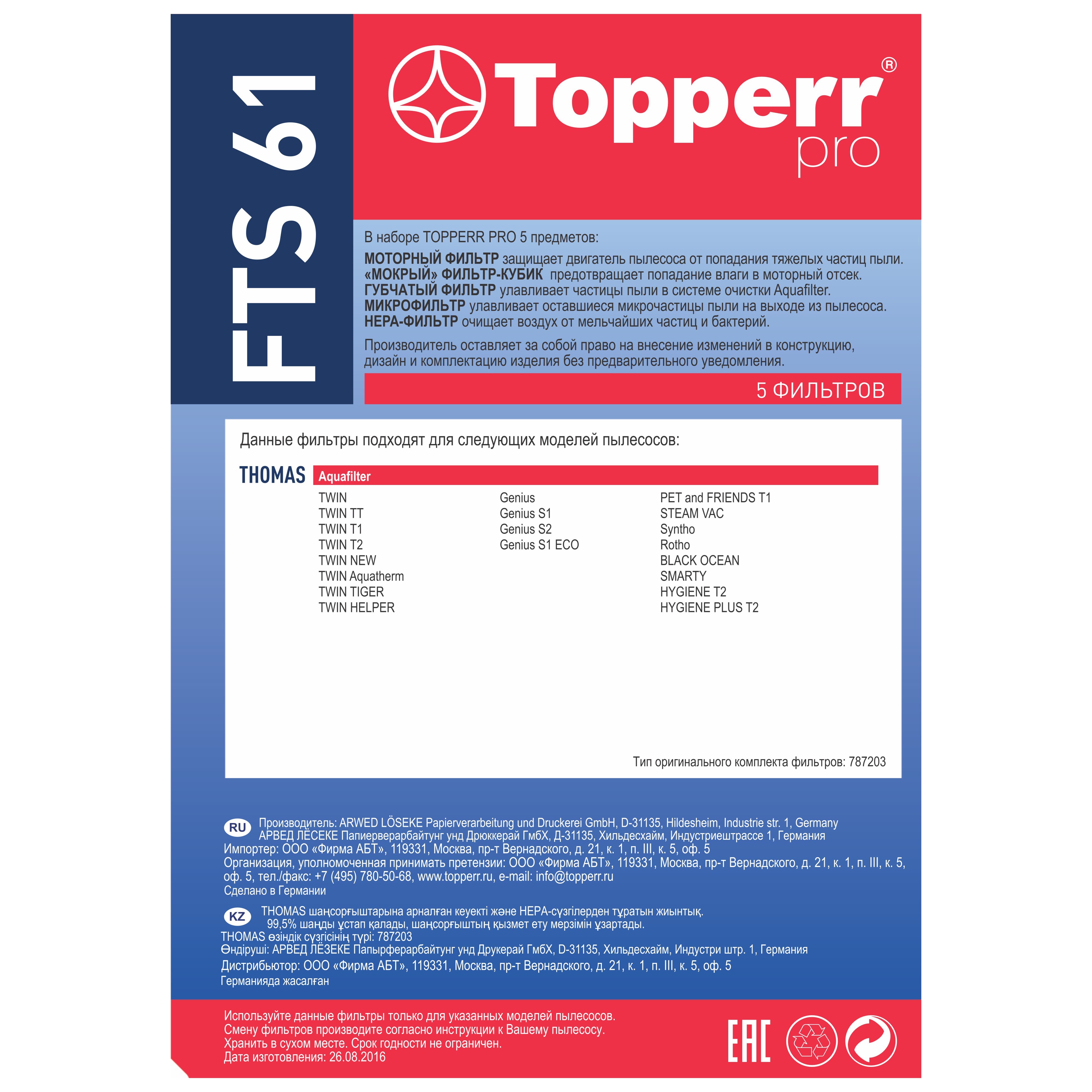 Topperr FTS 61 комплект фильтров для пылесосов Thomas (5 фильтров) (1109)