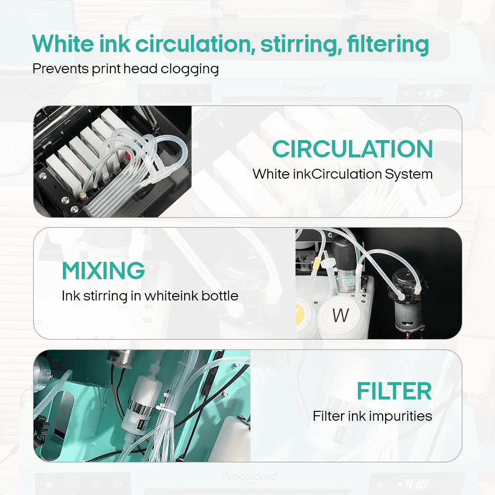 Чтобы улучшить печать белыми чернилами и снизить риск засорения печатающей головки, мы недавно разработали систему, включающую системы перемешивания, циркуляции и фильтрации, которые могут значительно улучшить активность белого Чернила, делают эффект белых чернил лучшим и снижают риск засорения печатающей головки, так что машина может продолжать работать хорошо и продлевать срок службы машины