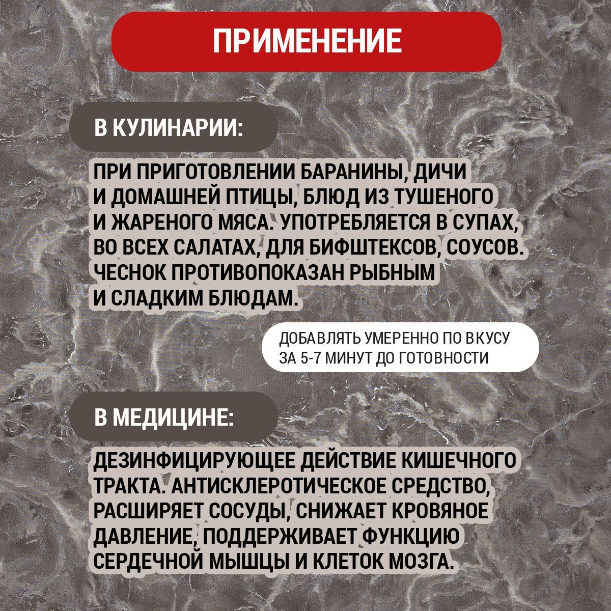 Назначение приправы: Для мясных блюд, Для блюд из картофеля, Для курицы, Для маринада, Для овощей, Для соусов, Для свинины