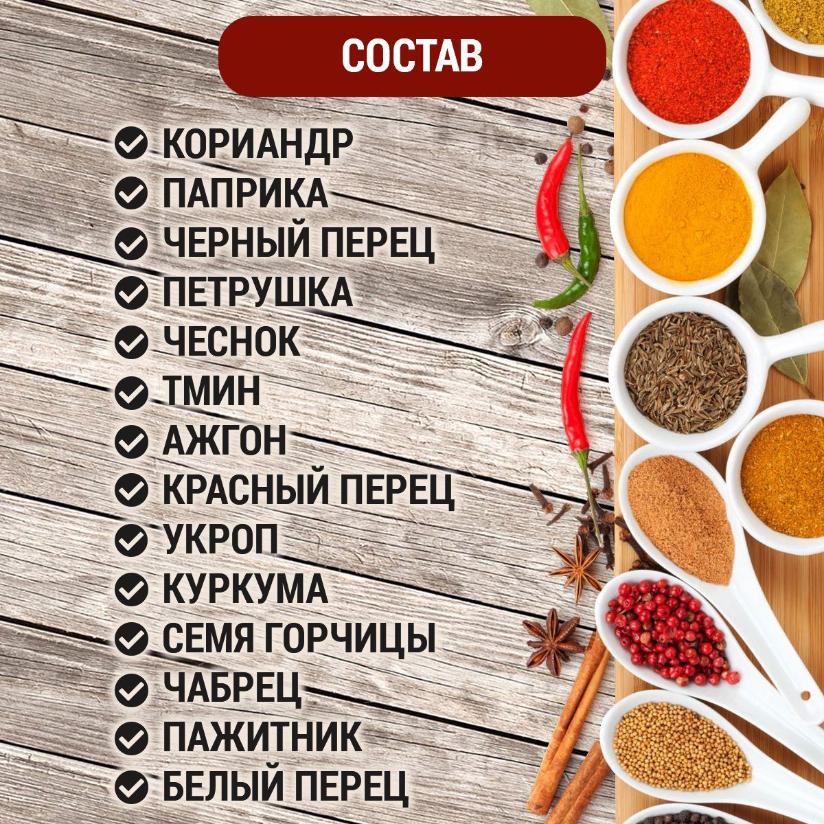 Кориандр, паприка, черный перец, петрушка, чеснок, тмин, ажгон, красный перец, укроп, куркума, семя горчицы, чабрец, пажитник, белый перец. Без соли, без усилителей!