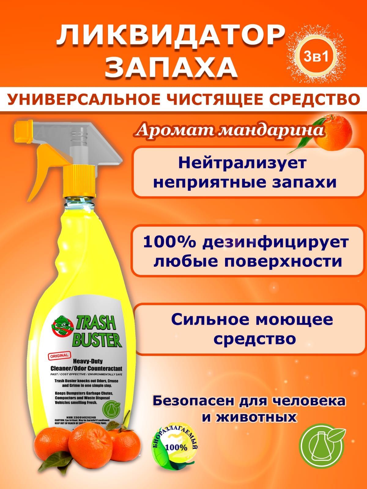 Описание: Один такой мандарин!Удалит самые стойкие запахи даже такие как кошачья моча на Вашем ковре! Средство предназначено для удаления запахов сильных источников таких как: Моча животных Коки, Собаки, стирка одежды и мойка туалетов Экскременты животных гарь табачный смок сырость запах бытовых отходов затхлость канализации туалетов Имеет запатентованную формулу не вредит и не раздражает человека и животных Разработано в лаборатории Российской компании Септохим Эколаджикал. Применение: нанесите средство с помощью спрей на источник запаха, дайте постоять 15 минут, при не об ходимости протрите салфеткой или смойте водой. Предосторожность: при попадание на слизистые промойте обильно водой! Объем средства в триггер 500 мл льет Автомат дозатор, Внимание в бутылке есть свободный объем специально, для людей с чутким слухом на запахи, если нужно снизить силу запаха то отвинтите триггер и долейте воды под горло бутылки и чуткое обоняние не будет страдать ни У Вас ни у Ваших питомцев!!! Трэш Бастер от Септохим!!!