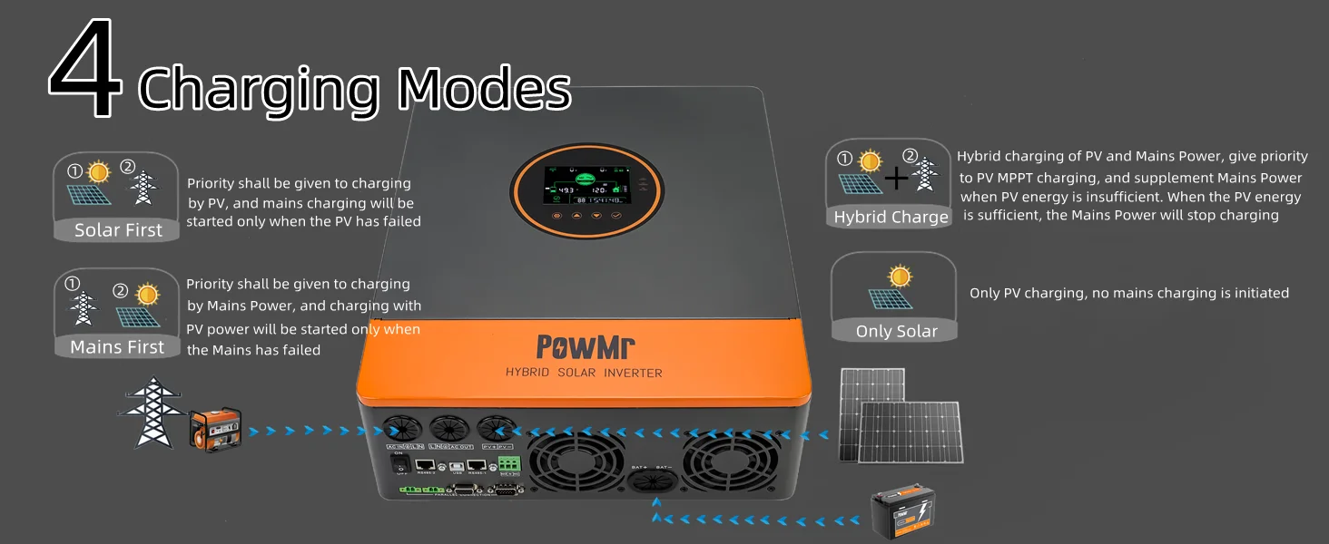 4 режима зарядки/2 режима разрядки Поддержка 4 режимов зарядки: Только солнечная энергия, приоритет сети, приоритет солнечной энергии и гибридная зарядка от сети и солнечной энергии; байпас сети и выход инвертора два режима вывода, бесперебойное питание; Функция подключения к сети с защитой от обратного потока, поддержка использования без батареи, может быть настроена для выработки электроэнергии в сети.