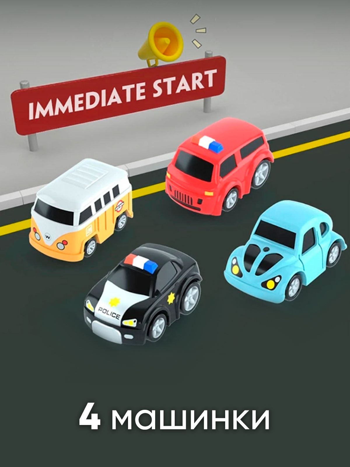 в комплекте предусмотрено четыре разных автомобиля: автобус, полицейская, пожарная и гоночная машинка, из которых можно выбрать именно тот, который понравится вашему ребенку.