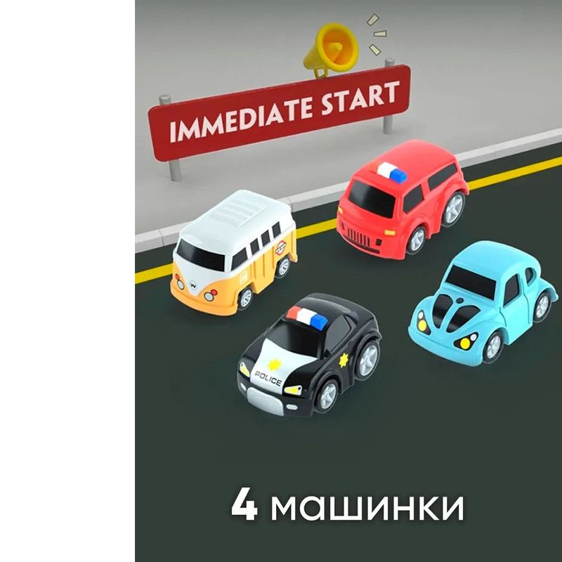 в комплекте предусмотрено четыре разных автомобиля: автобус, полицейская, пожарная и гоночная машинка, из которых можно выбрать именно тот, который понравится вашему ребенку.