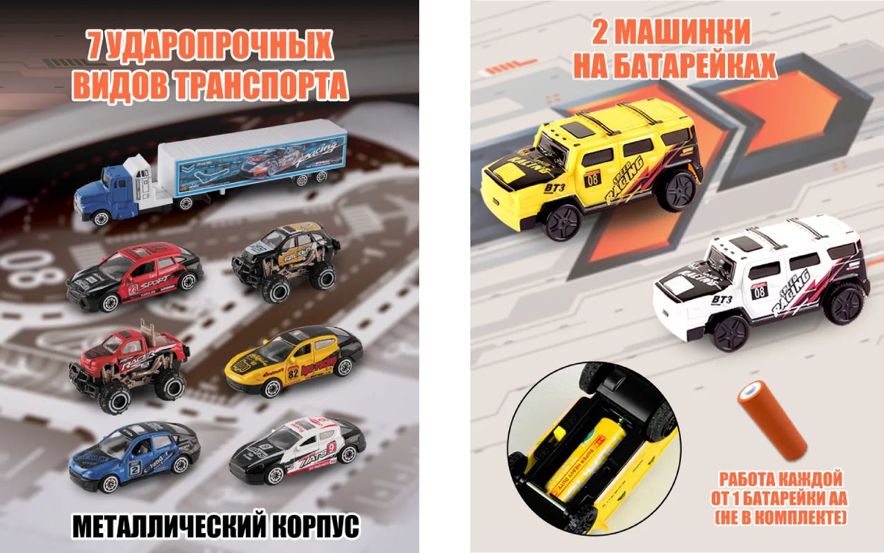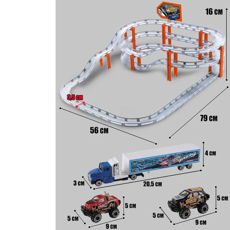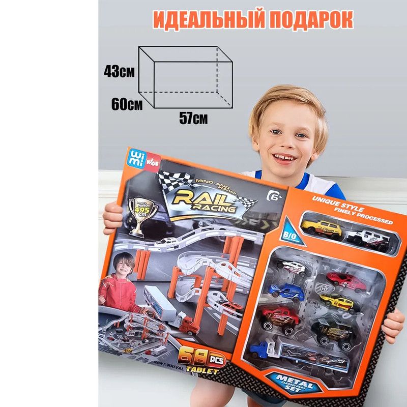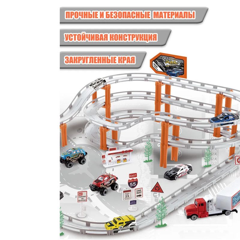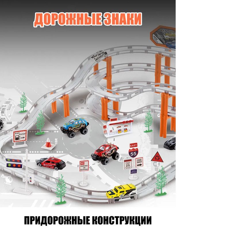 Трек длиной 495 см приведет в восторг юных гонщиков.Качественные материалыИгровой набор включает 68 элементов и 9 видов транспорта: 7 ударопрочных металлических машинок и 2 машинки