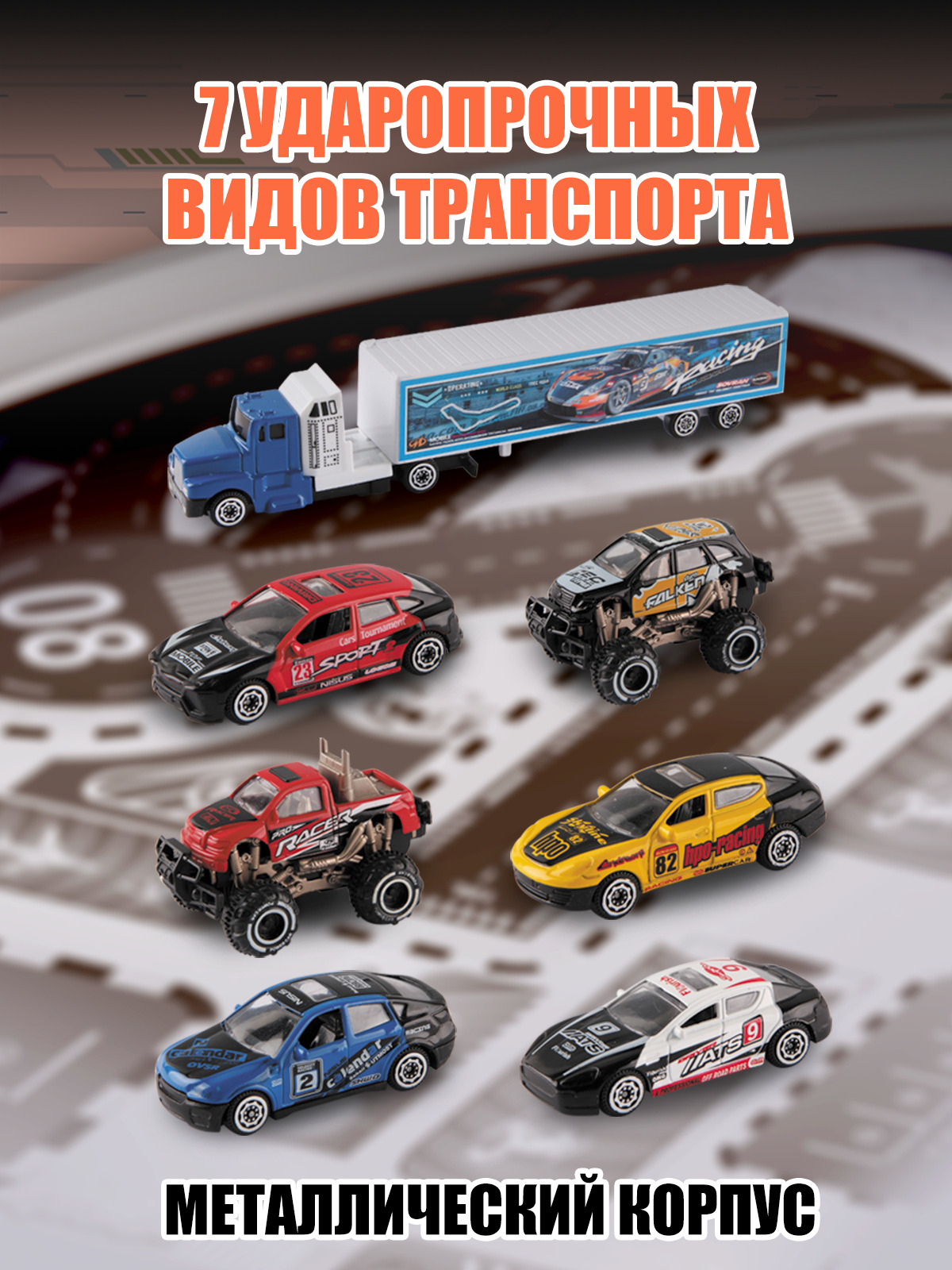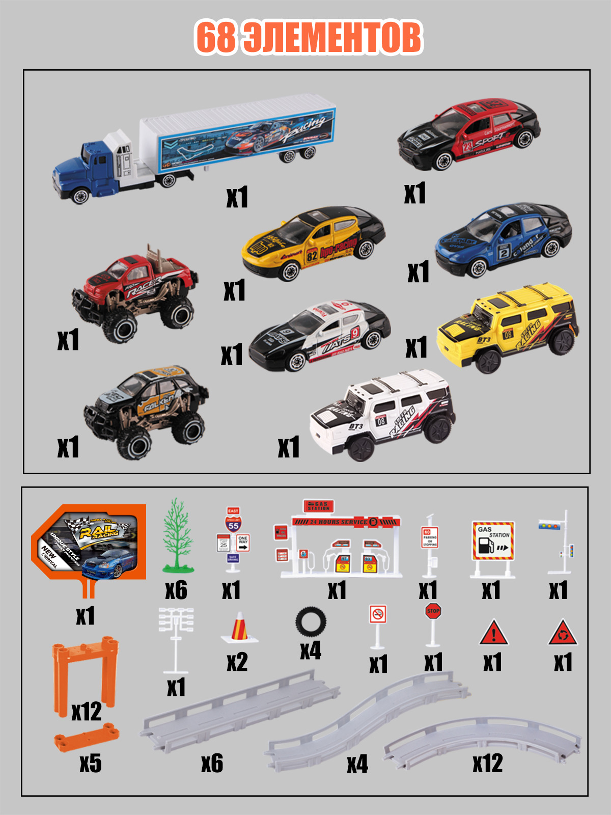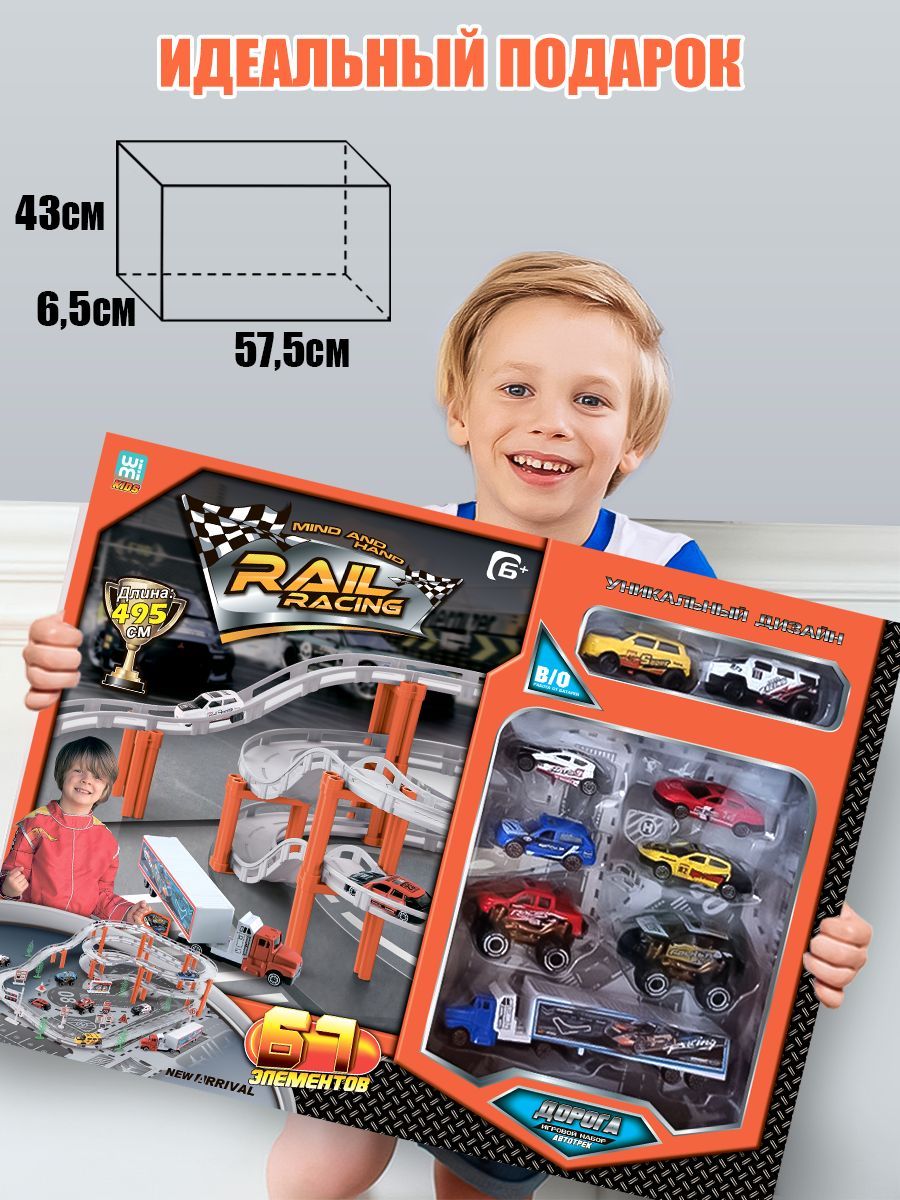 Трек длиной 495 см приведет в восторг юных гонщиков.Качественные материалыИгровой набор включает 68 элементов и 9 видов транспорта: 7 ударопрочных металлических машинок и 2 машинки