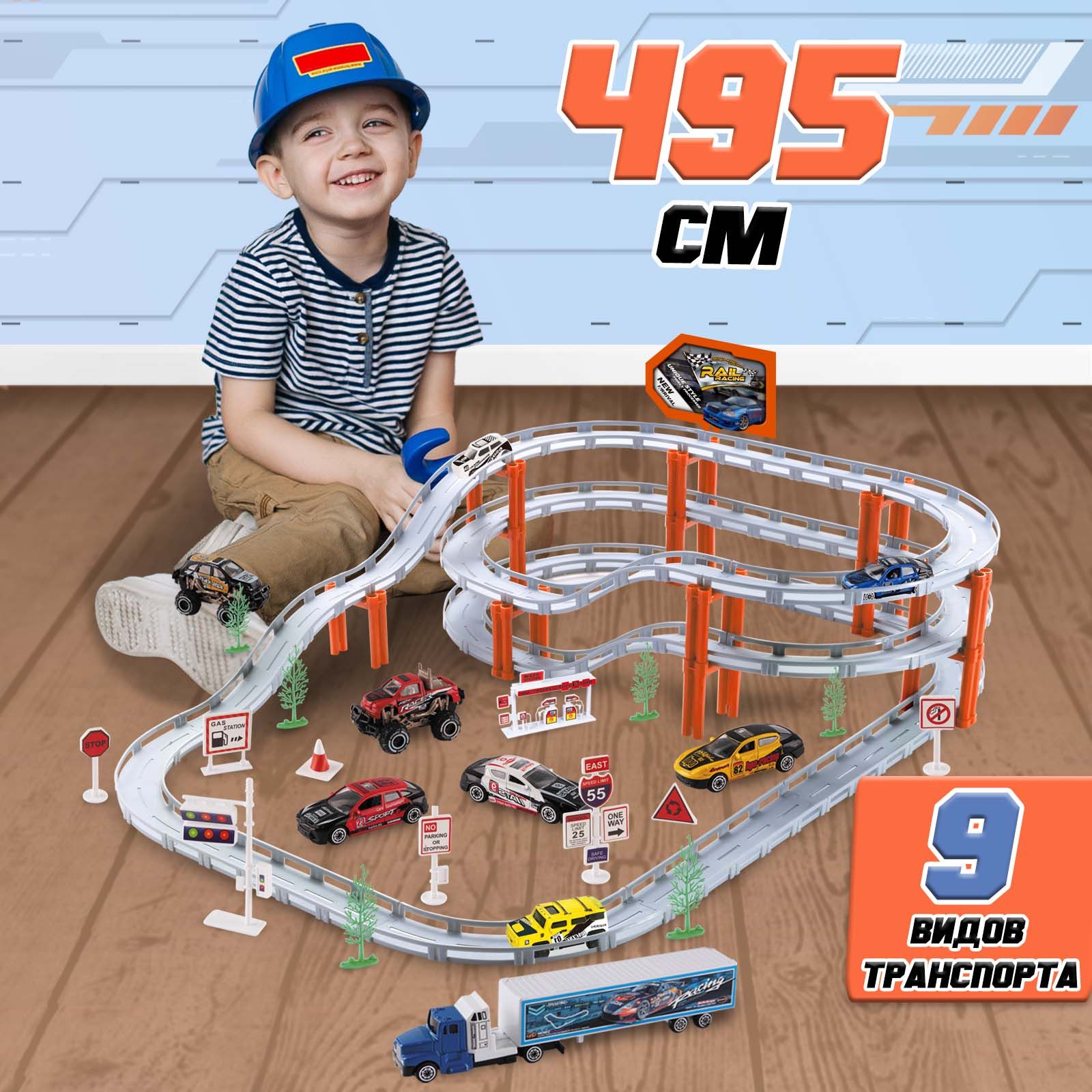 Трек с машинками скоростной WiMi длиной 495 см, горка многоуровневая, парковка интерактивная, автомобили металлические в наборе, 9 штук