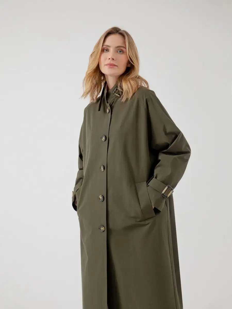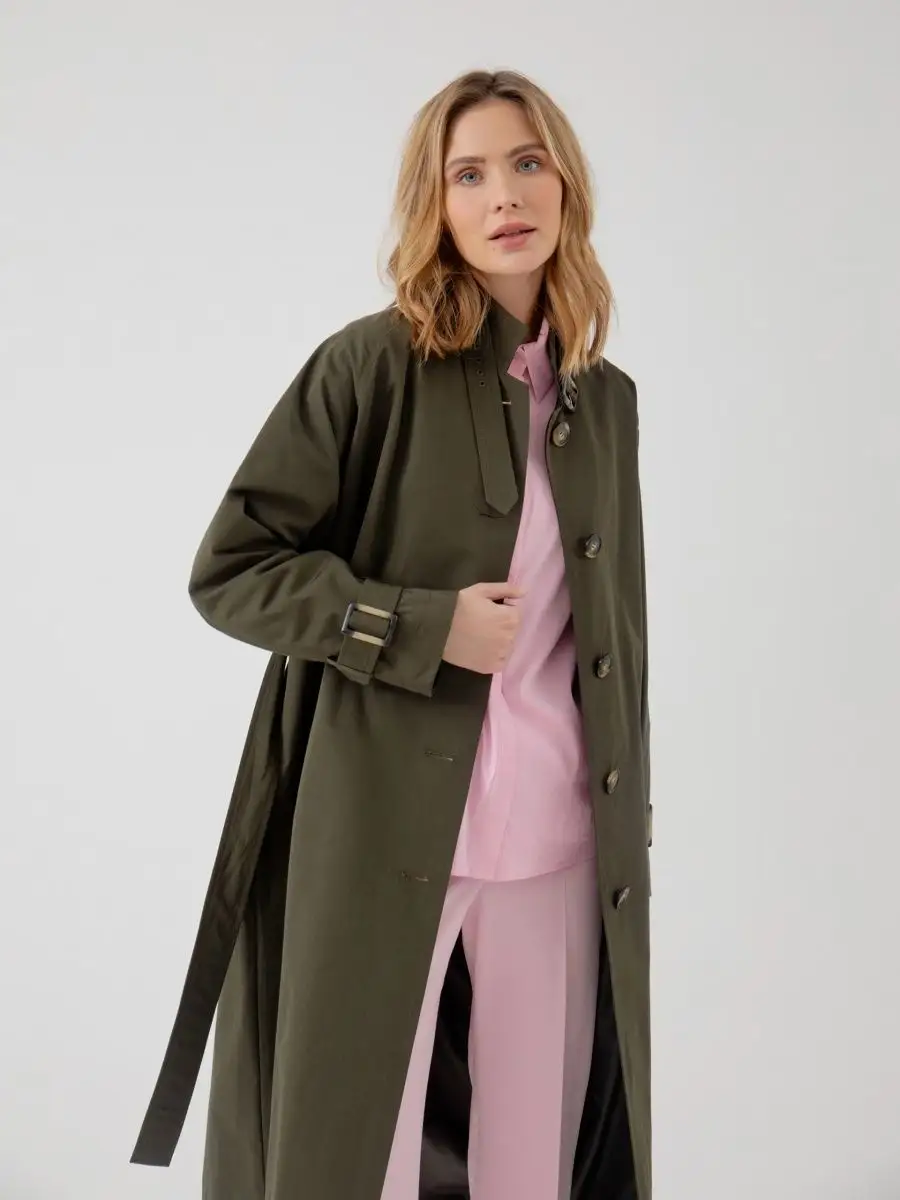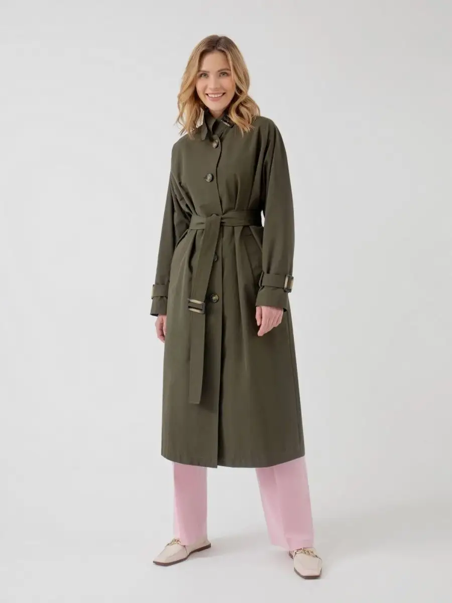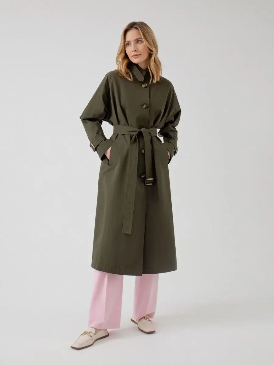 Тренч демисезонный длинный плащ хаки с поясом весна 2023