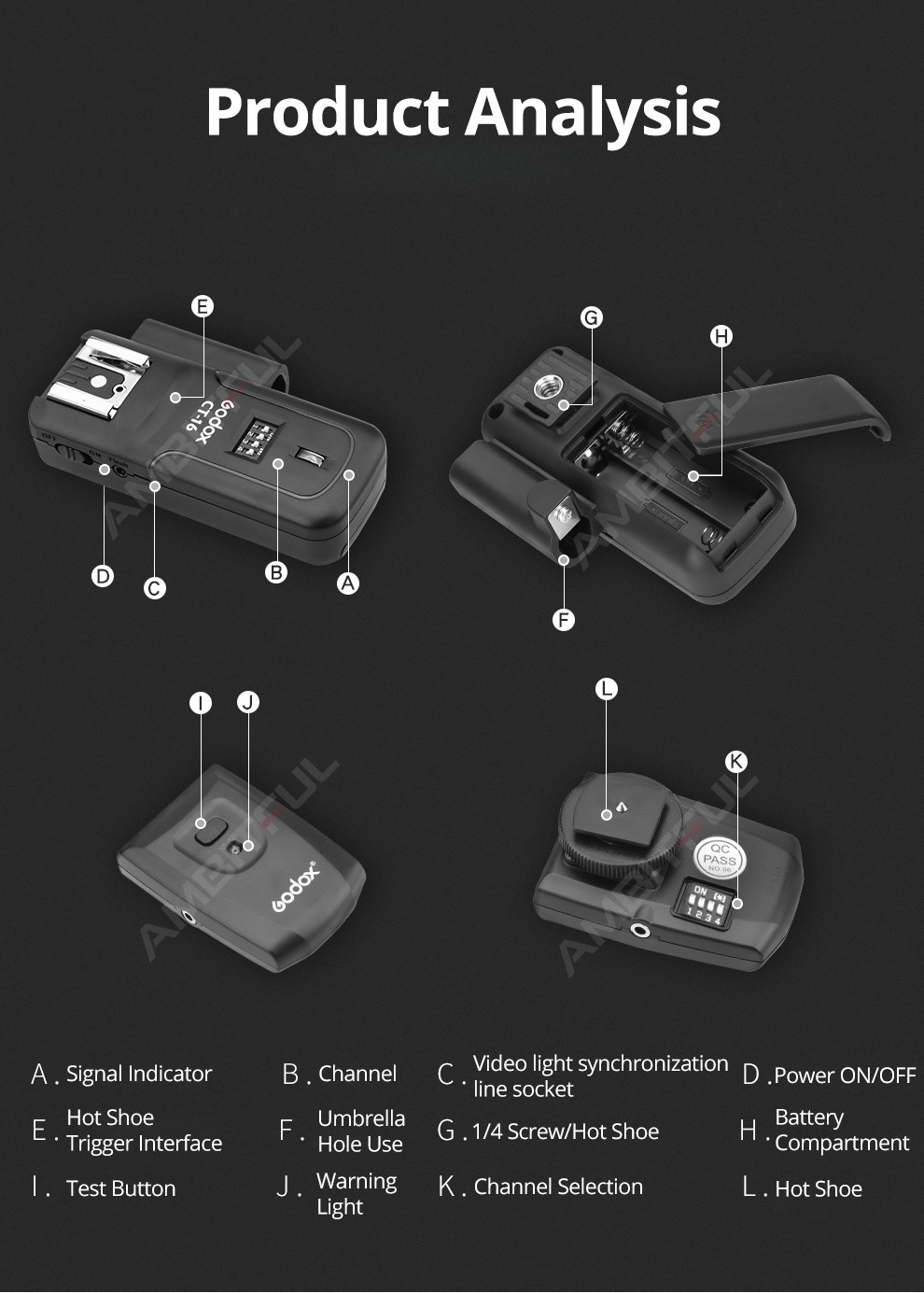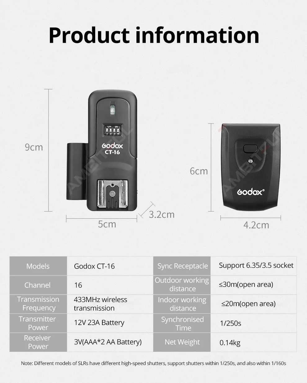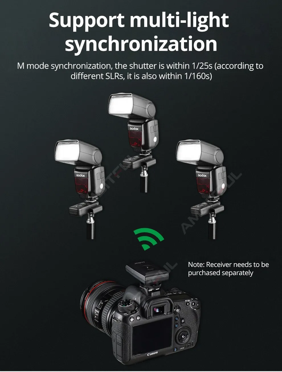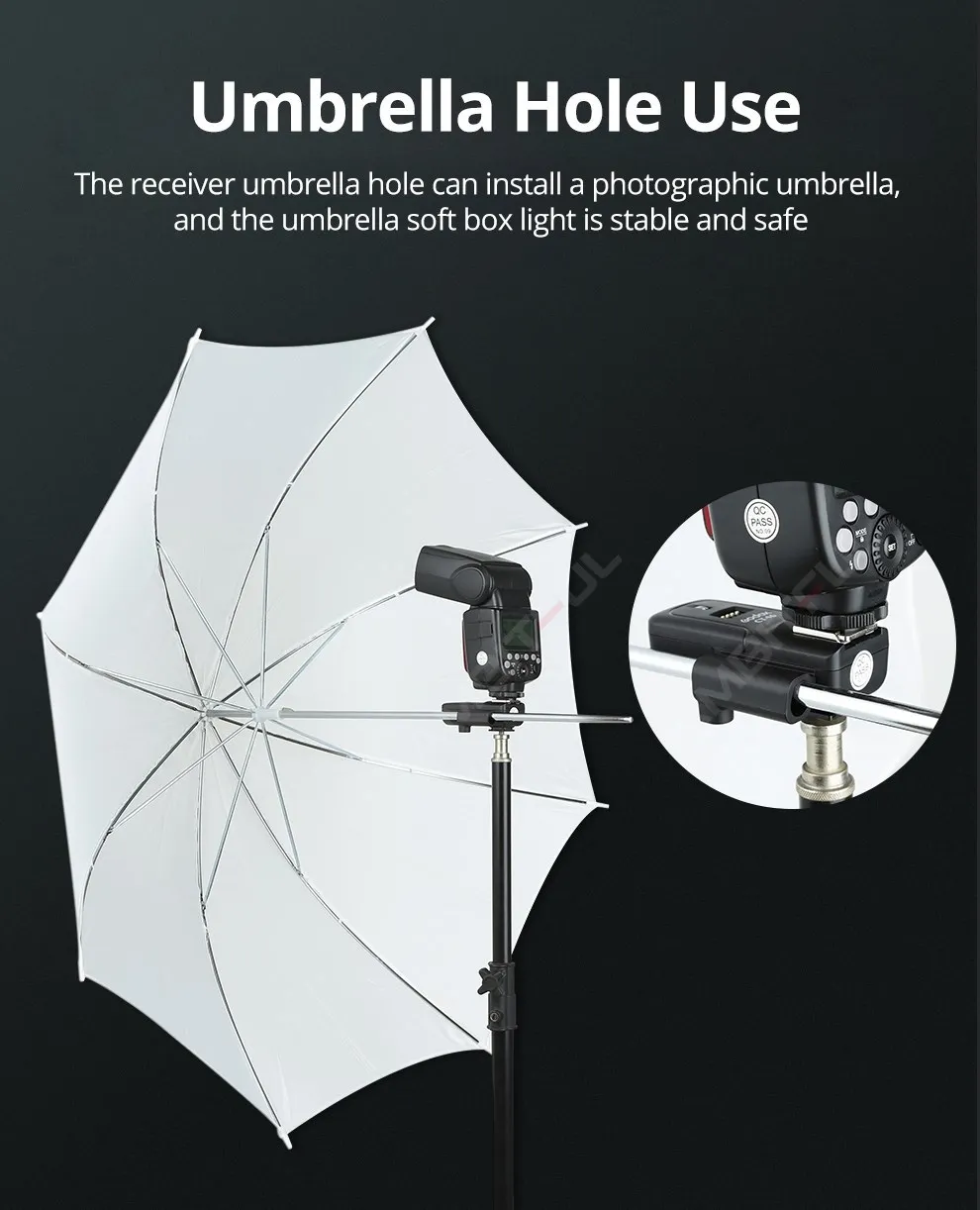Триггер приемника принимает сухую батарею для источника питания, которая является безопасной, энергосберегающей и удобной. Продукт принимает микрокомпьютер для управления декодированием, который имеет превосходную способность анти-помех; Чувствительная скорость реакции, самая высокая Синхронная скорость может достигать 1/250 сек.