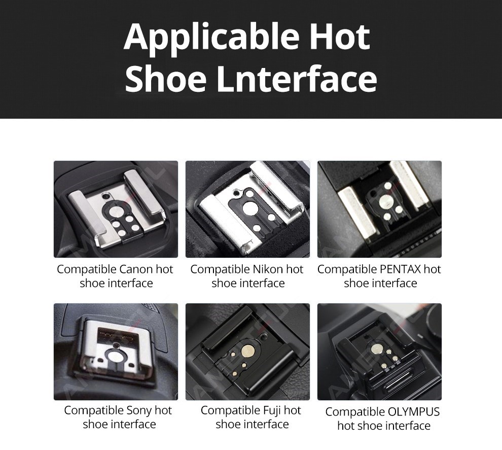 Работайте со вспышками, используя универсальный горячий башмак, такой как для Nikon, для Sigma, для Olympus, для Pentax (кроме SONY, так как они используют специальный горячий башмак)